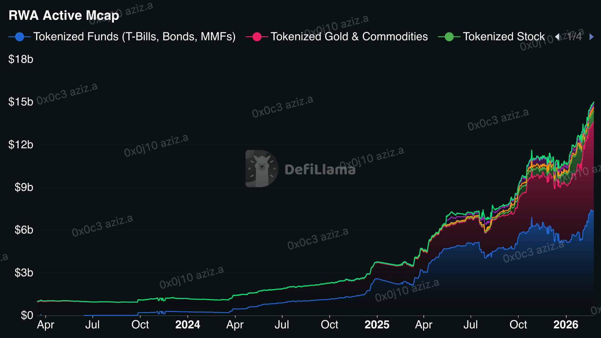 تجاوزت القيمة السوقية النشطة للأصول الحقيقية المُدارة (RWA) 15 مليار دولار هذا الأسبوع لأول مرة، وفقًا لـ DefiLlama. وتُعنى القيمة السوقية النشطة بتتبع التوكنات المُوزعة على حامليها المستقلين أو العقود الذكية. رأس مال حقيقي في محافظ حقيقية، يدعم أصولًا حقيقية على السلسلة.