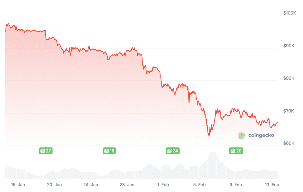 Après avoir tenté plus tôt cette semaine de repasser au-dessus de la barre des 72 000 dollars, le bitcoin est retombé jeudi à 65 000 dollars. Le cours oscille désormais légèrement au-dessus, à 67 000 dollars. La récente tentative de sortir du creux de la vague semble donc avoir perdu de son élan.