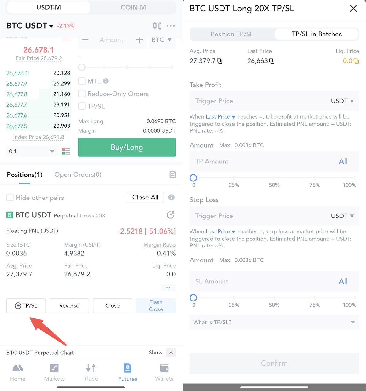 گام 1: از صفحه اصلی اپلیکیشن MEXC وارد بخش فیوچرز شوید. در سمت راست رابط معاملاتی، بخش پیشرفته (Advanced) را باز کرده و گزینه TP/SL را تنظیم کنید.