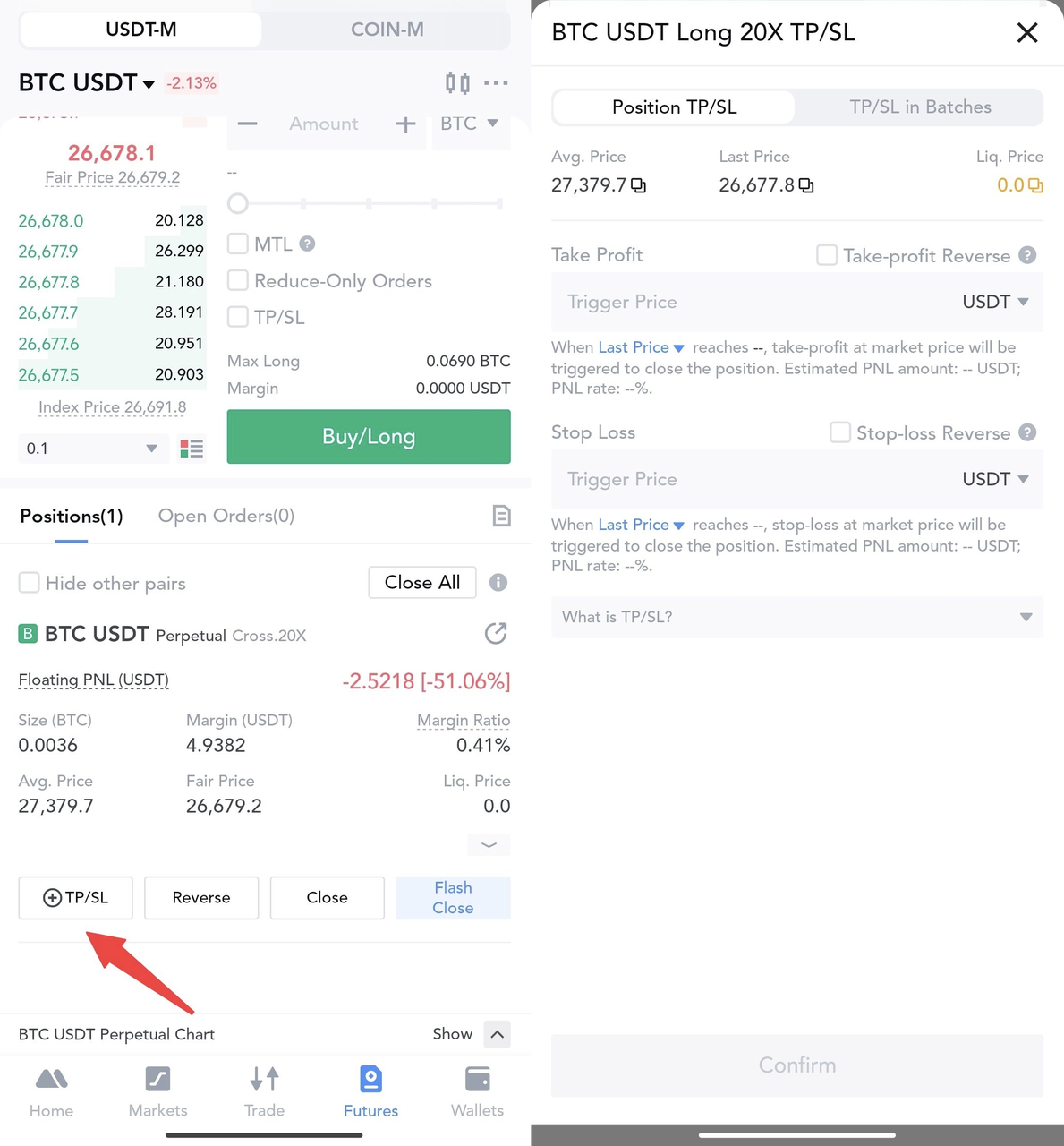 هنگام باز کردن یک موقعیت، میتوانید گزینه Set TP/SL را انتخاب کرده و یکی از قیمت های آخرین قیمت، قیمت منصفانه یا قیمت شاخص را به عنوان قیمت محرک مشخص کنید. پس از ثبت سفارش (چه به صورت جزئی یا کامل، و چه در قالب سفارش محدود یا بازار)، سیستم بلافاصله سفارش TP/SL شما را بر اساس سطح محرک تعیین شده فعال خواهد کرد.
