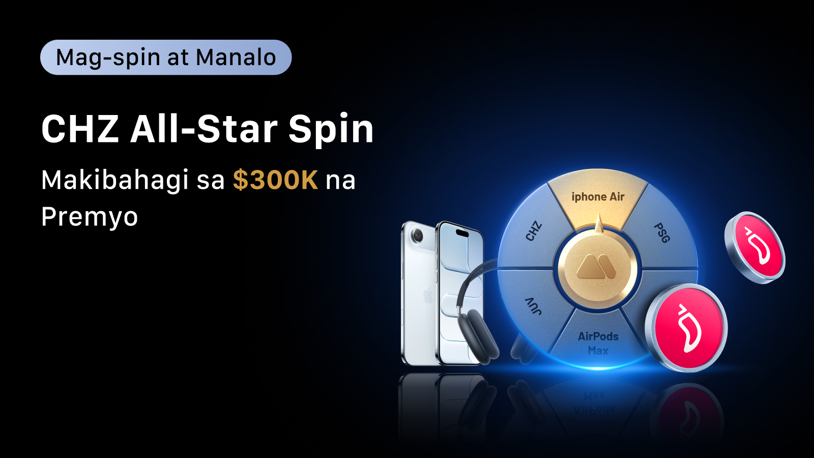 Tuwang-tuwa ang MEXC na ipakilala ang CHZ All-Star Spin! Ang event na ito ay magbibigay sa lahat ng user ng pagkakataong mag-spin at manalo mula sa napakalaking 300,000 prize pool! Nagtatampok ng mga pares ng CHZ at Fan Token na maaaring ipagpalit, pinagsasama ng eventg= na ito ang kasabikan ng isports at mga reward ng Web3 trading. Sumali na ngayon para sa mga eksklusibong pisikal na premyo kabilang ang iPhone Air at AirPods Max!