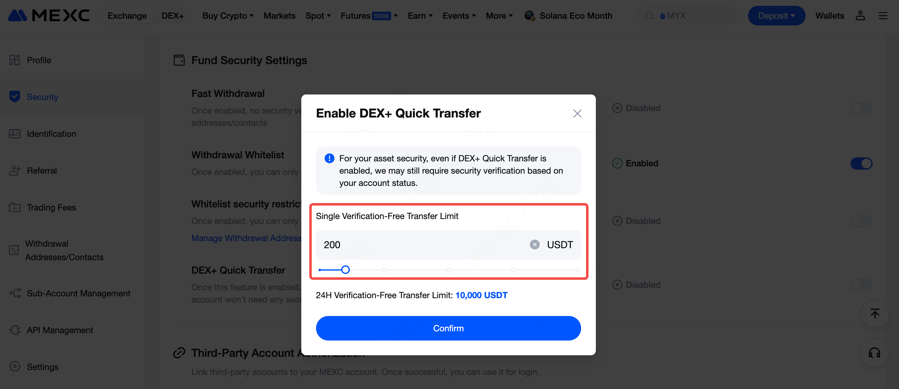 I-click ang toggle button sa tabi ng "DEX+ Mabilis na Pagtransfer," ilagay ang iisang limitasyon sa paglilipat na walang pag-verify (1-2,000 USDT, hal., 200 USDT), pagkatapos ay i-click ang Kumpirmahin.