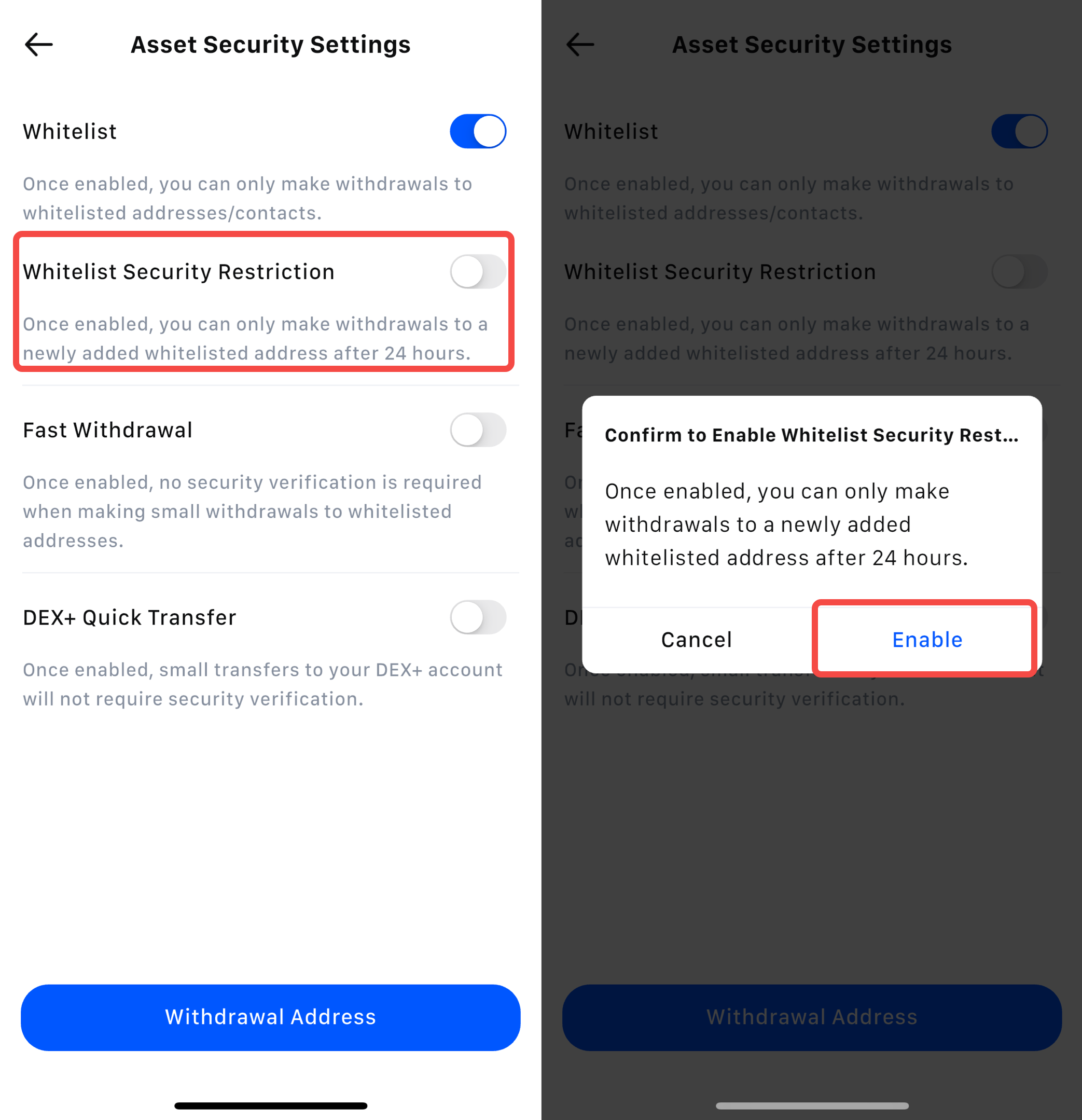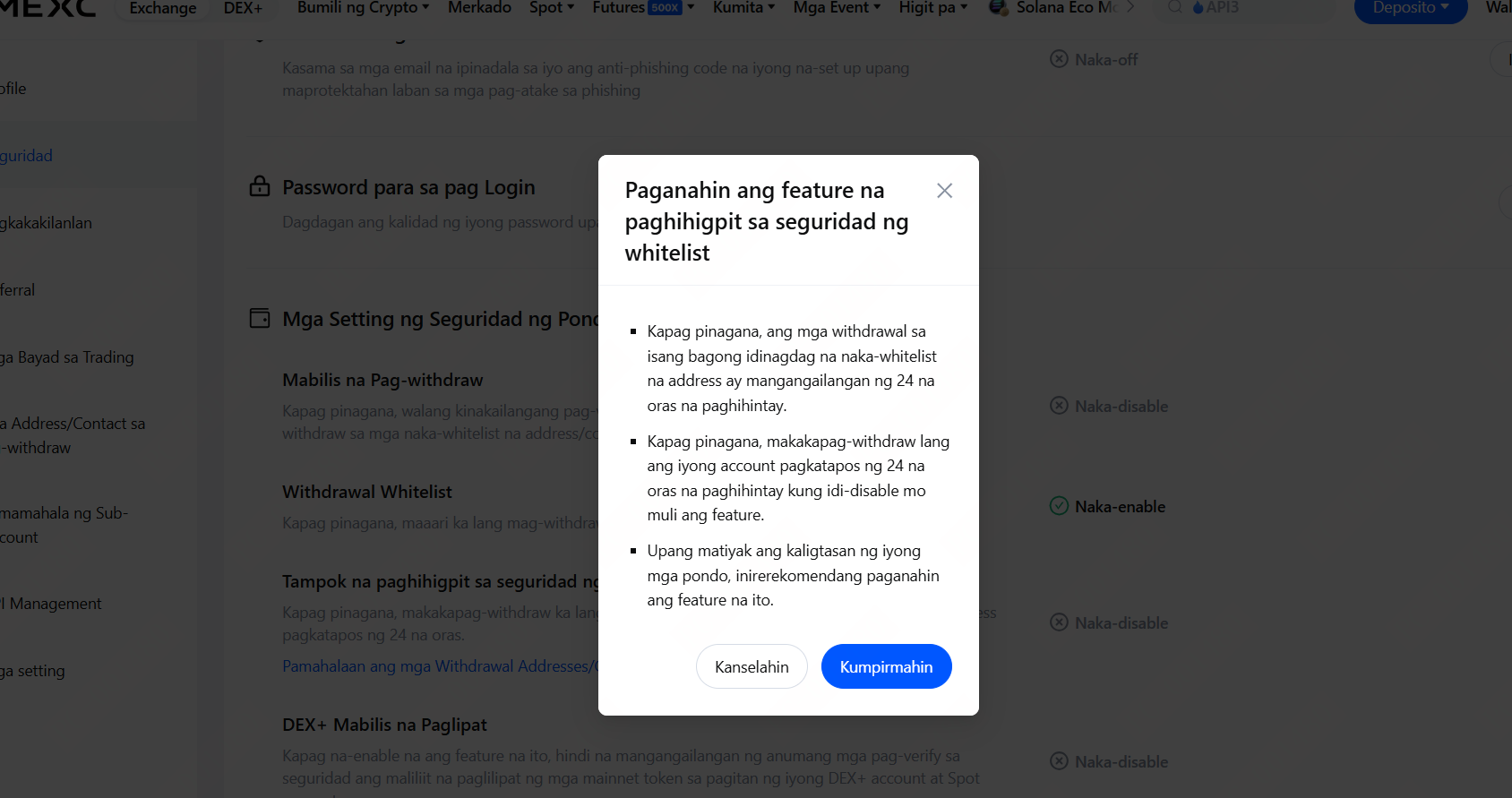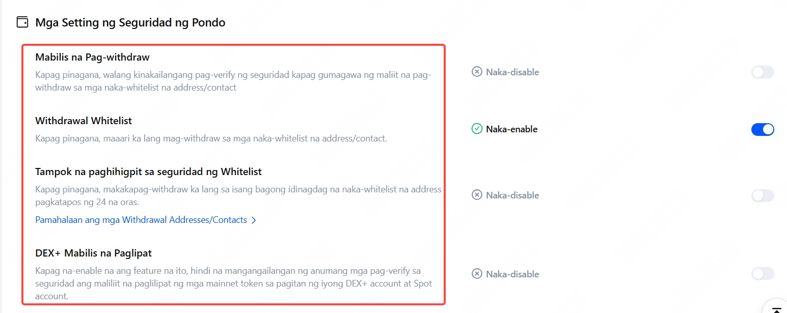 • Kapag na-enable na, ang mga withdrawal sa mga bagong idinagdag na whitelist na address ay mangangailangan ng 24 na oras na panahon ng paghihintay.