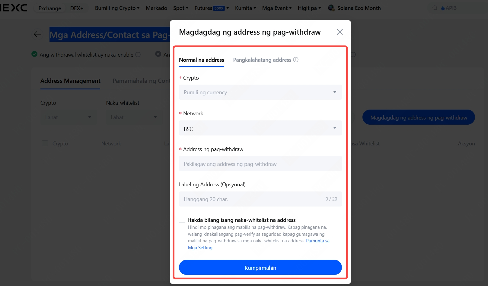 Mag-click sa Magdagdag ng Withdrawal Address, piliin ang Normal na address, punan ang crypto, transfer network, withdrawal address, at address label (opsyonal). Pagkatapos, lagyan ng check ang checkbox sa tabi ng "Itakda bilang isang naka-whitelist na address," at i-click ang Kumpirmahin.
