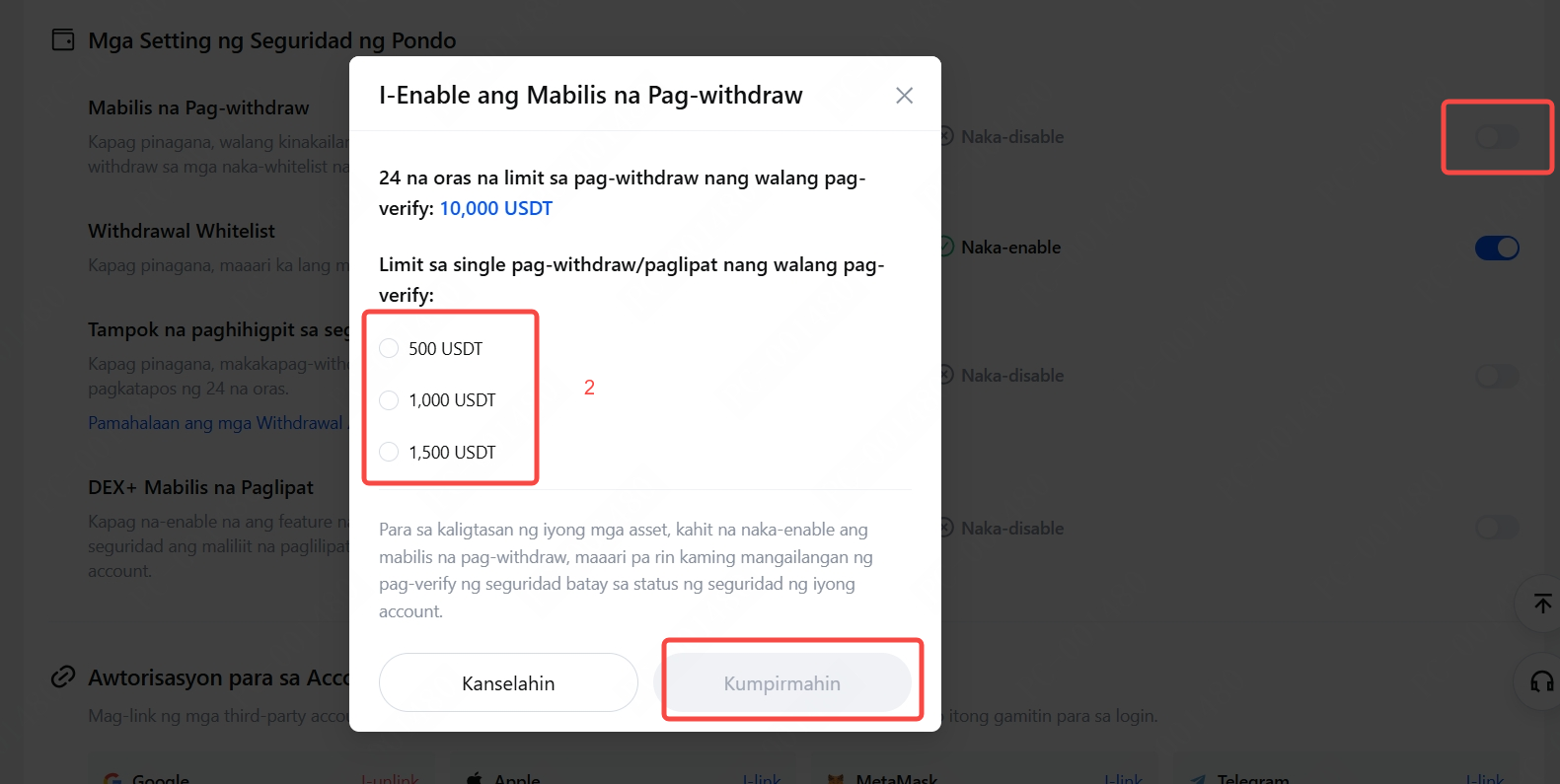 I-click ang toggle button sa kanang bahagi ng "Mabilis na Pag-withdraw", piliin ang limitasyon sa halaga ng isang beses na pag-withdraw/paglipat nang walang pag-verify. Dito, gagamitin namin ang 500 USDT bilang halimbawa. Mag-click sa Kumpirmahin.