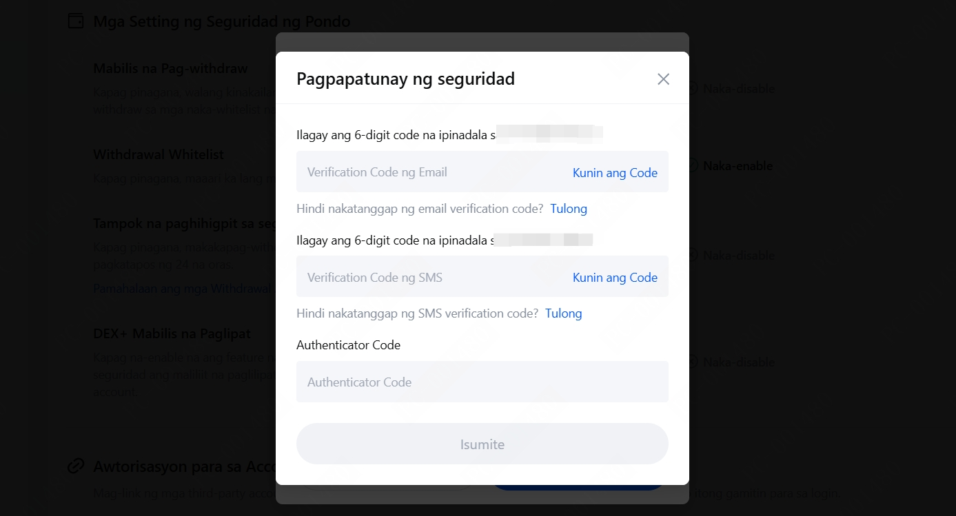 Kapag nagpasimula ng withdrawal, kailangan mong mag-input ng mga email verification code, mobile verification code, at Google Authenticator code. Ito ang lahat ng mga hakbang sa seguridad sa loob ng balangkas ng two-factor authentication (2FA). Upang matiyak ang seguridad ng iyong account, inirerekumenda na paganahin ang hindi bababa sa isang paraan ng two-factor authentication. Kung gusto mong matutunan kung paano i-set up ang Google Authenticator, maaari kang sumangguni sa "Pagli-link ng Google Authenticator." Sa mga advanced na setting ng seguridad, maaari mong i-configure ang mga withdrawal upang matiyak ang kaligtasan ng iyong mga personal na asset.