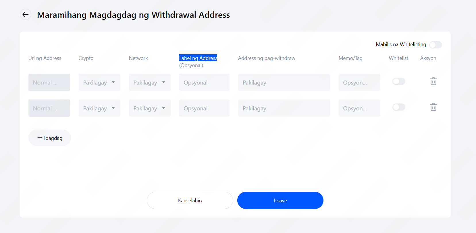Kung gusto mong magdagdag ng maramihang address sa iyong whitelist nang bulto, maaari kang mag-click sa Pagdaragdag ng Bulk. Sa pahinang "Maramihang Magdagdag ng Withdrawal Address", punan ang crypto, transfer network, label ng Address (opsyonal), address ng pag-withdraw, memo/tag (opsyonal), at paganahin ang "Whitelist" na opsyon. Kapag naidagdag mo na ang lahat ng mga address, i-click ang I-save.