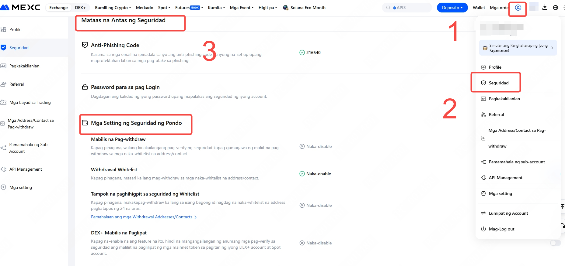 Mag-log in sa MEXC, pumunta sa icon ng user sa kanang sulok sa itaas ng homepage, at piliin ang Seguridad. Mag-scroll pababa sa "Advanced na Seguridad," at sa ibaba ay makikita mo ang "Mga Setting ng Seguridad ng Pondo."