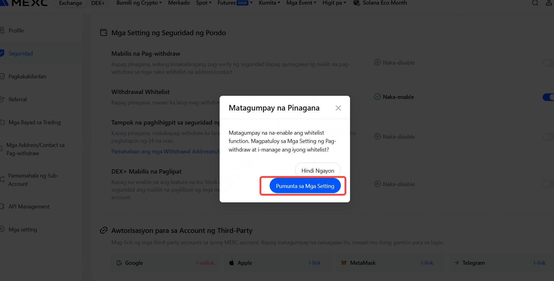 • Kung hindi mo pinagana ang feature na ito pagkatapos paganahin ito, ang iyong account ay kailangang maghintay ng 24 na oras bago muling magawa ang mga withdrawal.