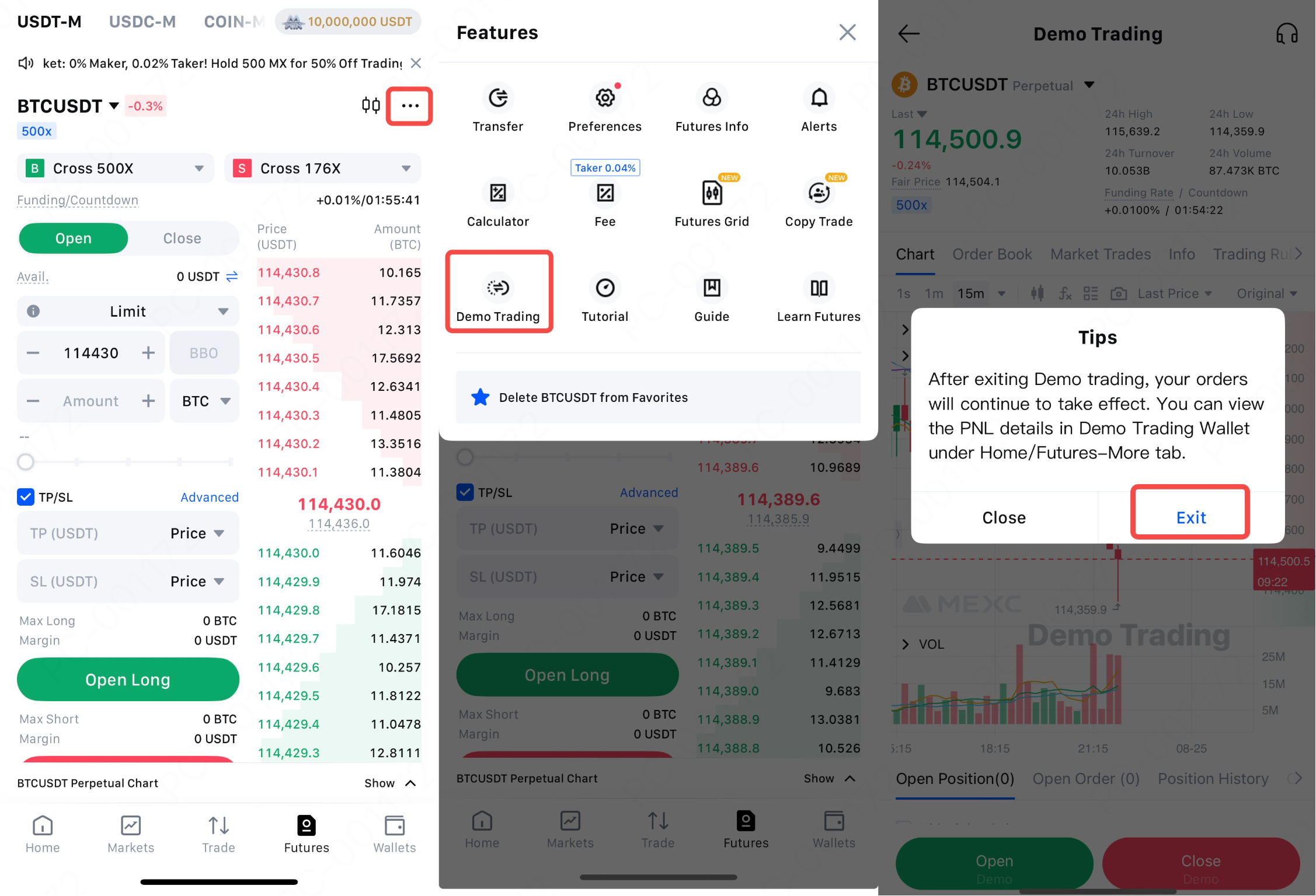 Buksan ang MEXC App at i-tap ang Futures sa ibaba para makapasok sa live na interface ng kalakalan. I-tap ang … sa kanang sulok sa itaas upang ma-access ang tampok na Demo Trading. Kung gusto mong lumabas sa Demo Trading, i-tap ang ← sa kaliwang sulok sa itaas ng screen ng Demo Trading at piliin ang Lumabas para bumalik sa live na market.