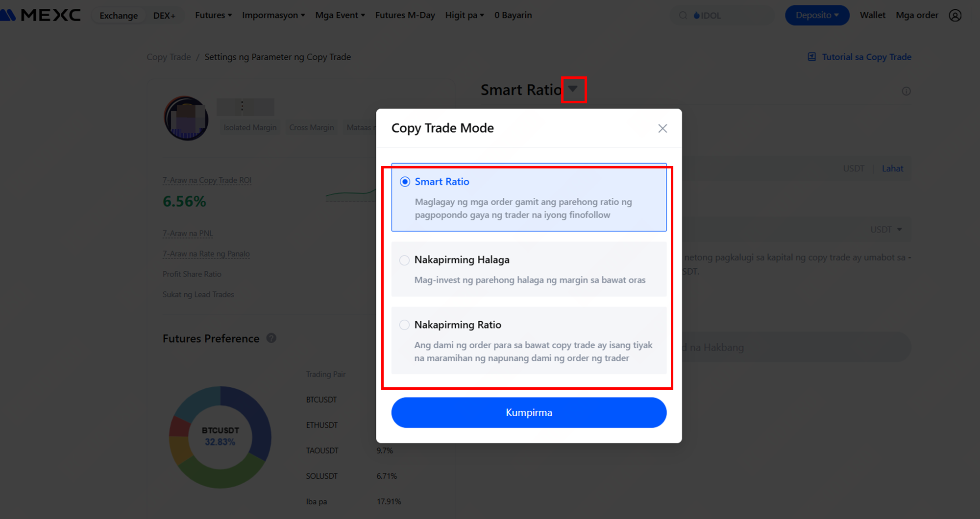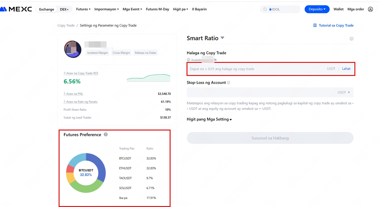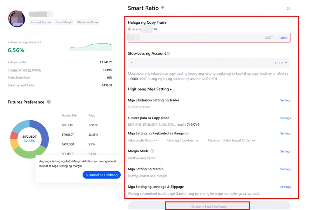 Ipapakita namin ang proseso ng copy trading gamit ang Smart Ratio method bilang isang halimbawa. Ang iba pang mga paraan ng pagkopya ng kalakalan ay gumagana nang parehas.