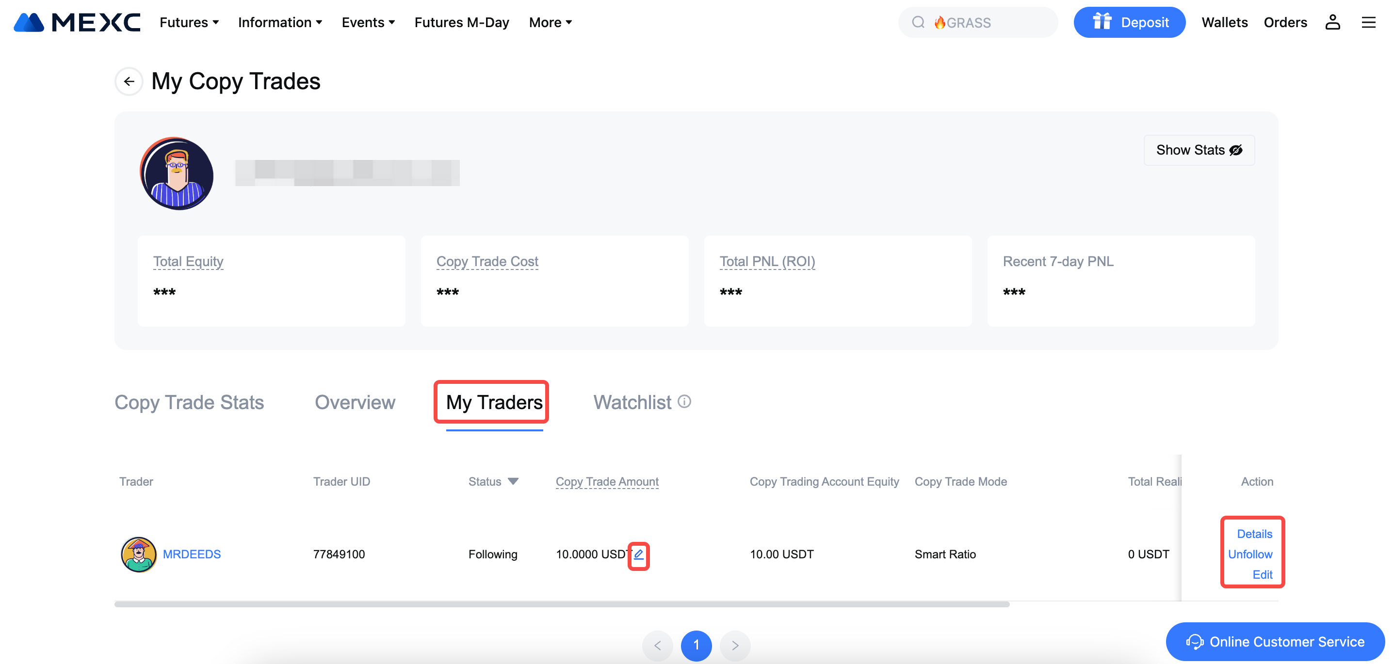 Sa seksyong My Copy Trades, mag-click sa [Aking Mga Trader] para makita ang kasalukuyang mga trade trade sa mga trader na sinusundan mo. Maaari mong i-click ang [I-unfollow] o [I-edit].