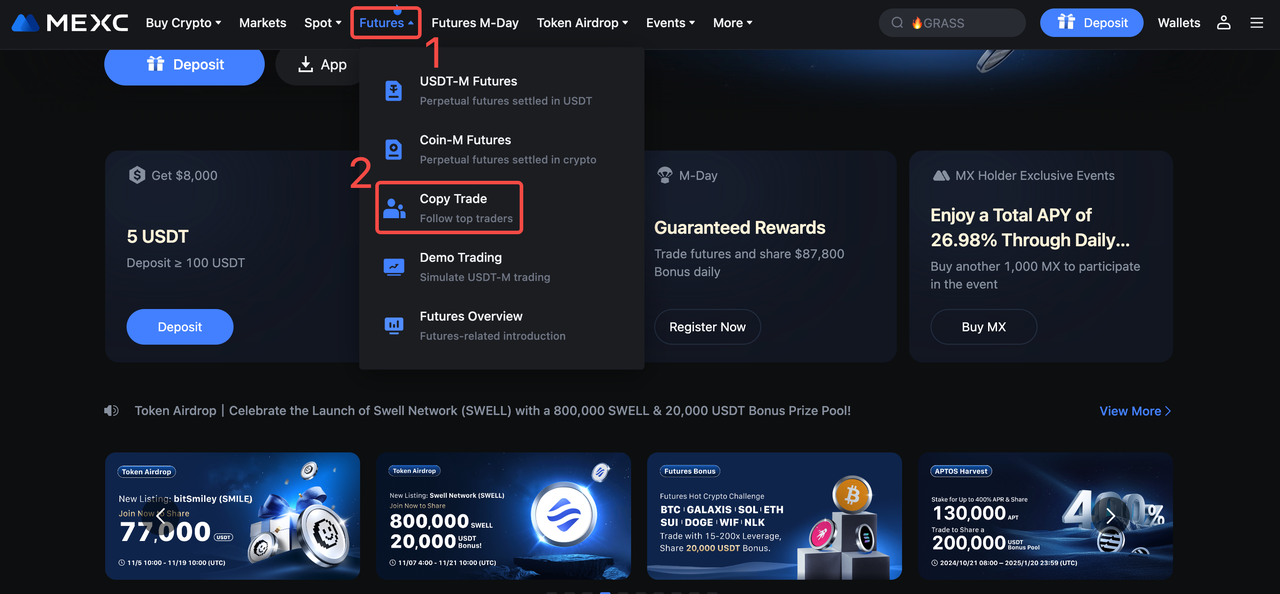 Buksan ang opisyal na website ng MEXC at mag-log in sa iyong account. Sa itaas, i-click ang [Futures] at piliin ang [Copy Trade] upang makapasok sa pahina ng MEXC Copy Trade.