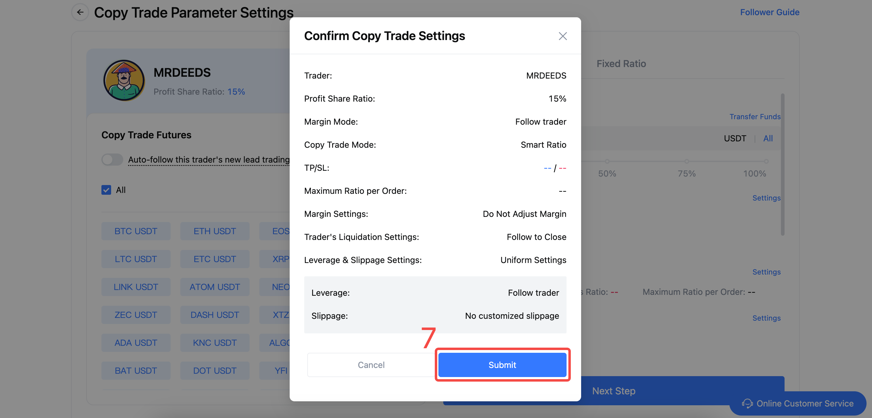 Suriin ang iyong mga setting ng copy trade, at sa sandaling makumpirma, i-click ang [Isumite] upang makumpleto ang proseso ng copy trading.