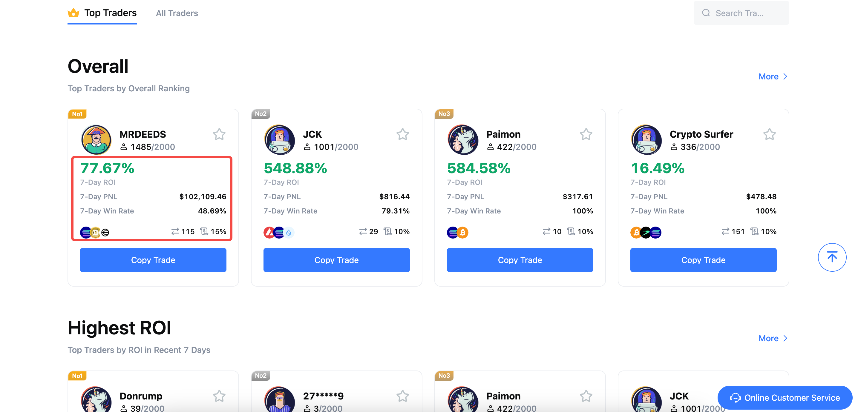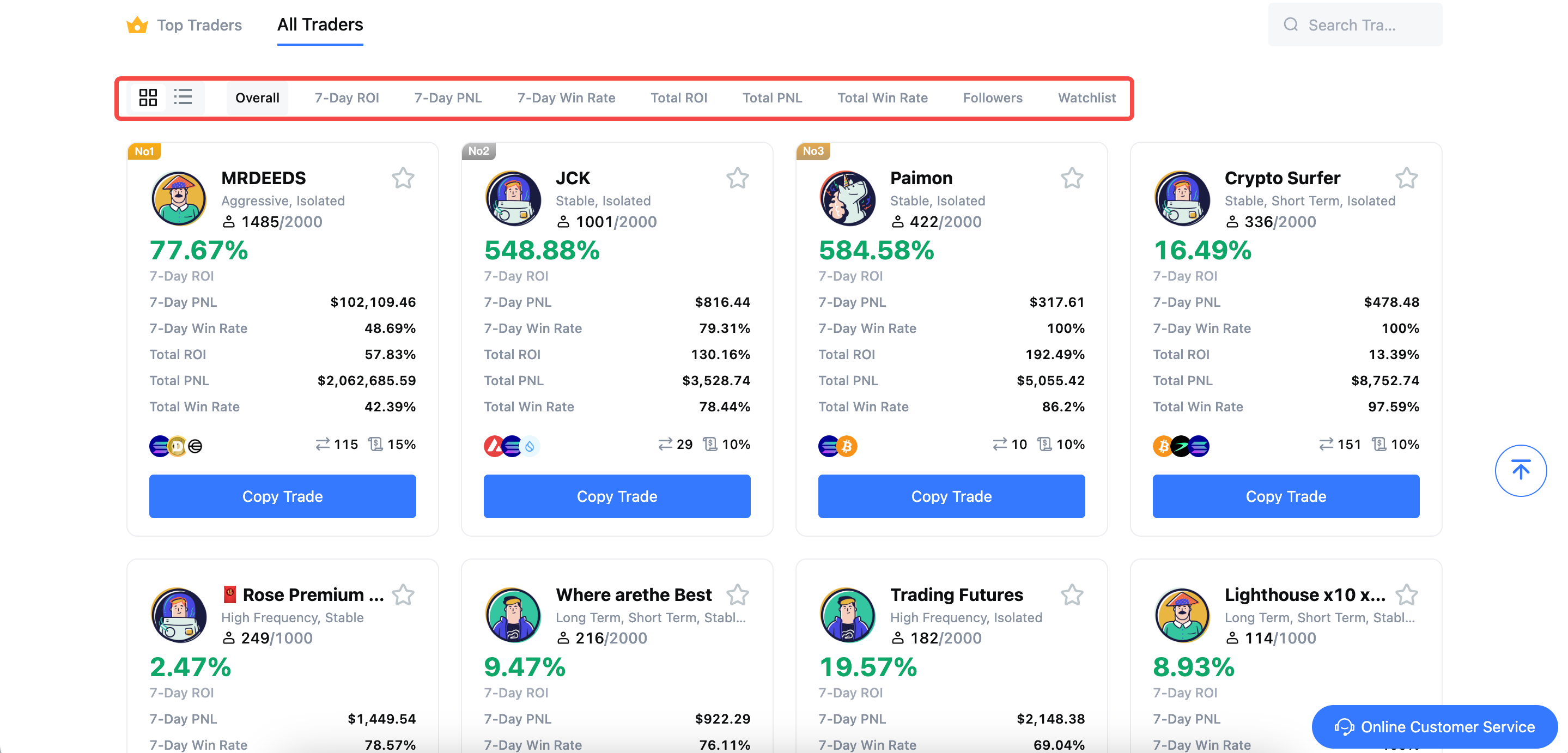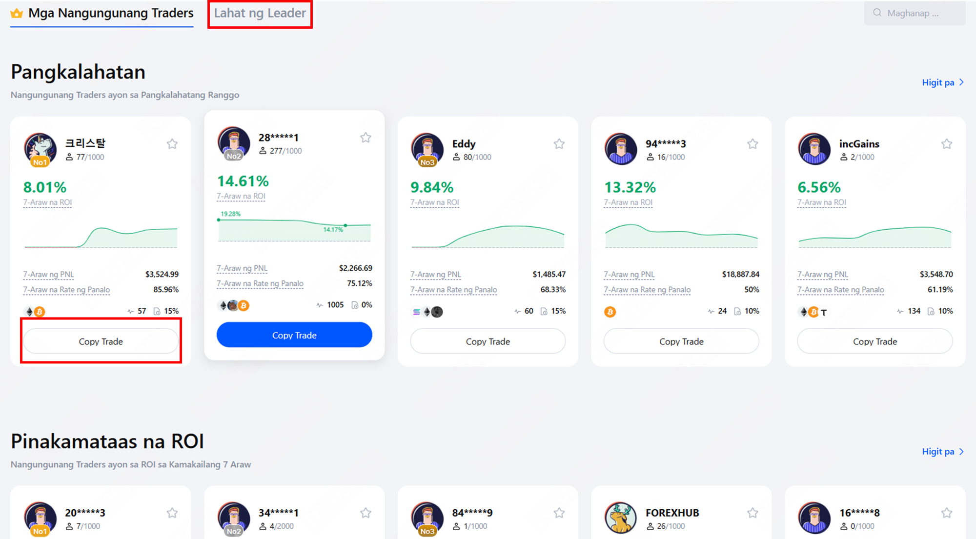 Sa pahina ng Copy Trade, mag-scroll pababa upang makita ang mga nangungunang mangangalakal na pinagsunod-sunod ayon sa mga kategorya tulad ng pangkalahatang ranggo, pinakamataas na ROI, at pinakamataas na PNL. Maaari ka ring mag-click sa [Lahat ng Leader] upang tingnan ang kumpletong listahan ng mga kasalukuyang mangangalakal. Piliin ang iyong gustong mangangalakal at i-click ang [Copy Trade] upang makapasok sa pahina ng Mga Setting ng Parameter ng Copy Trading.
