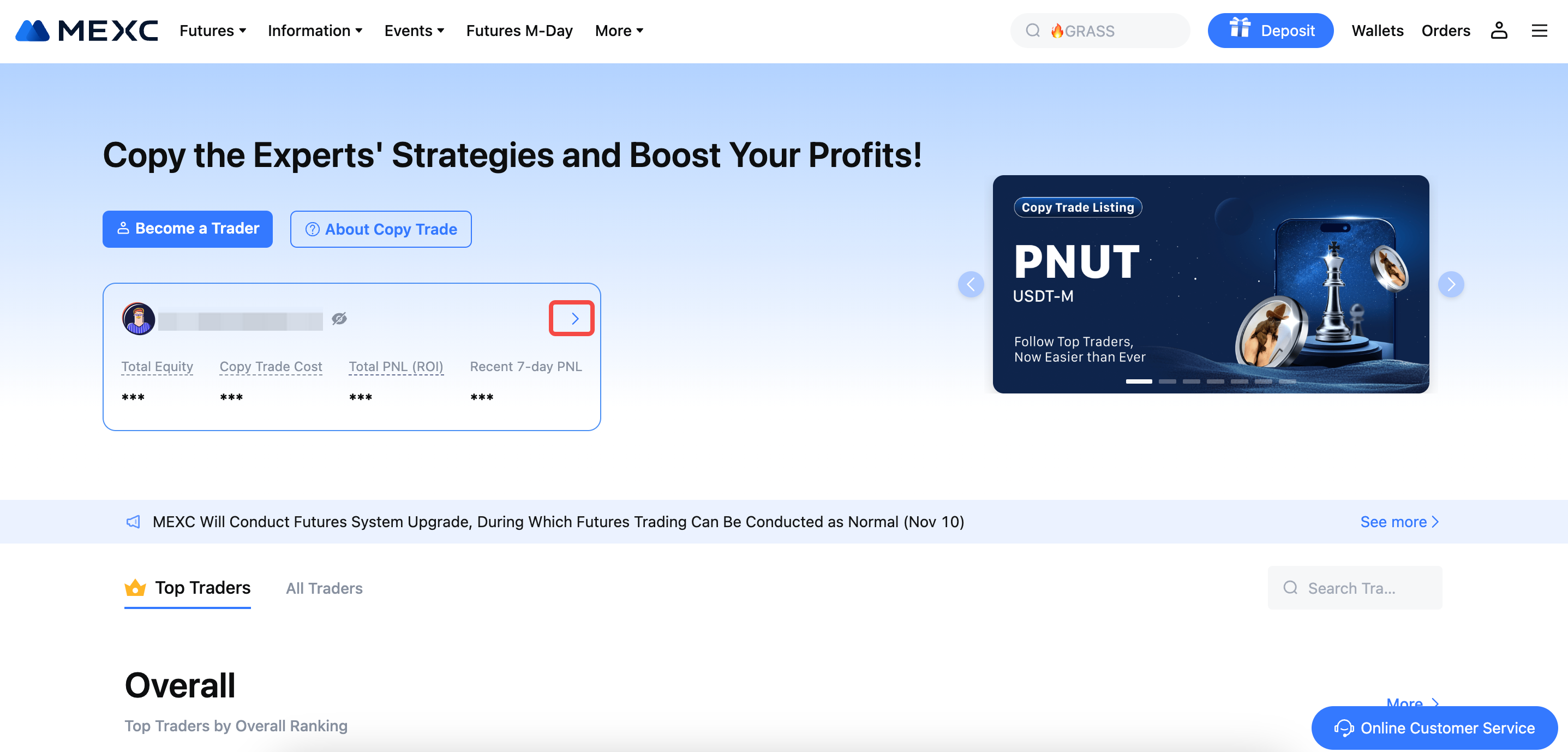 Sa pahina ng MEXC Copy Trade, i-click ang [>] sa trader card.