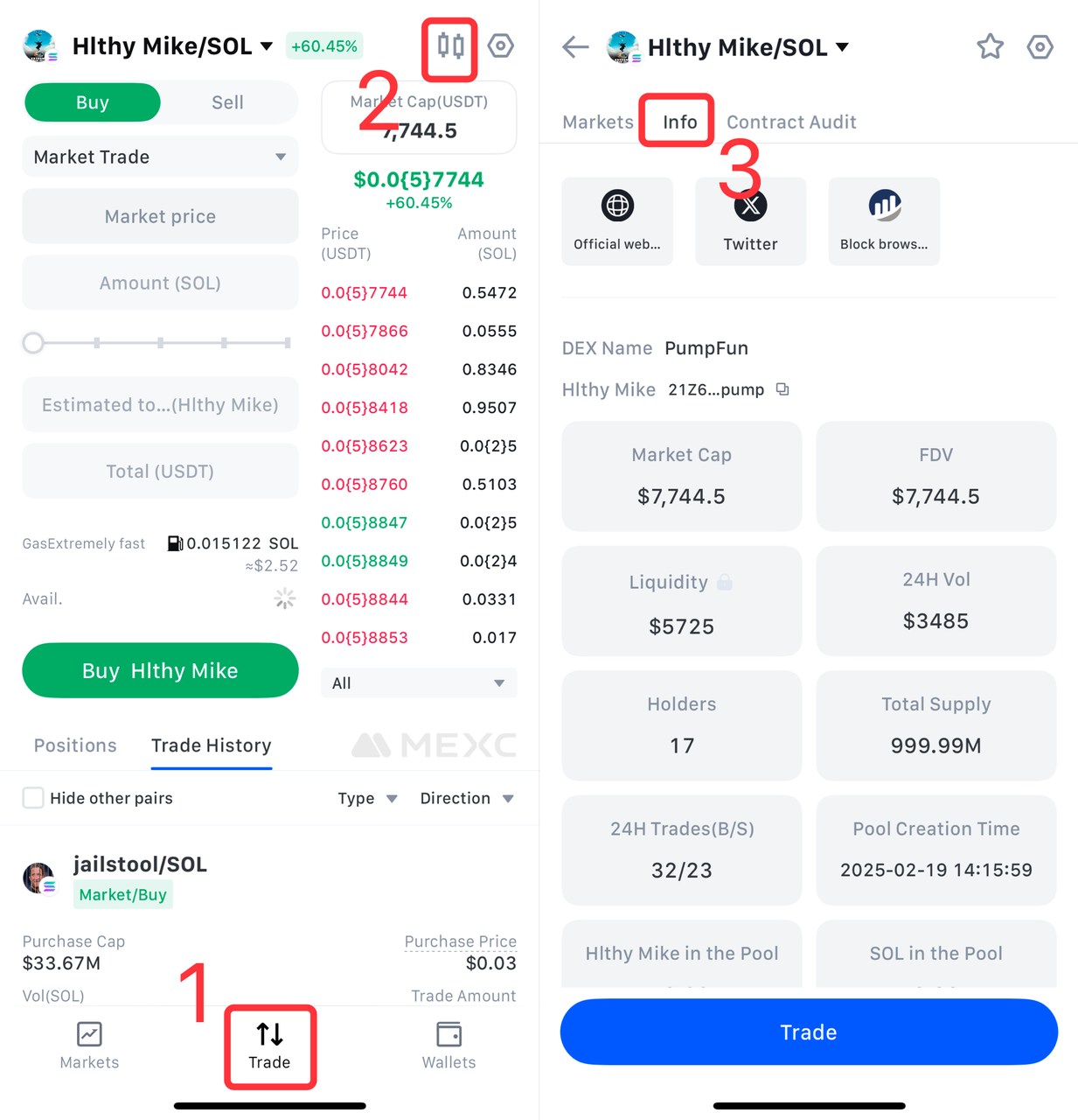 Sa pahina ng DEX+ trading, i-click ang candlestick icon at piliin ang Info para tingnan ang detalyadong impormasyon tungkol sa kasalukuyang trading token.