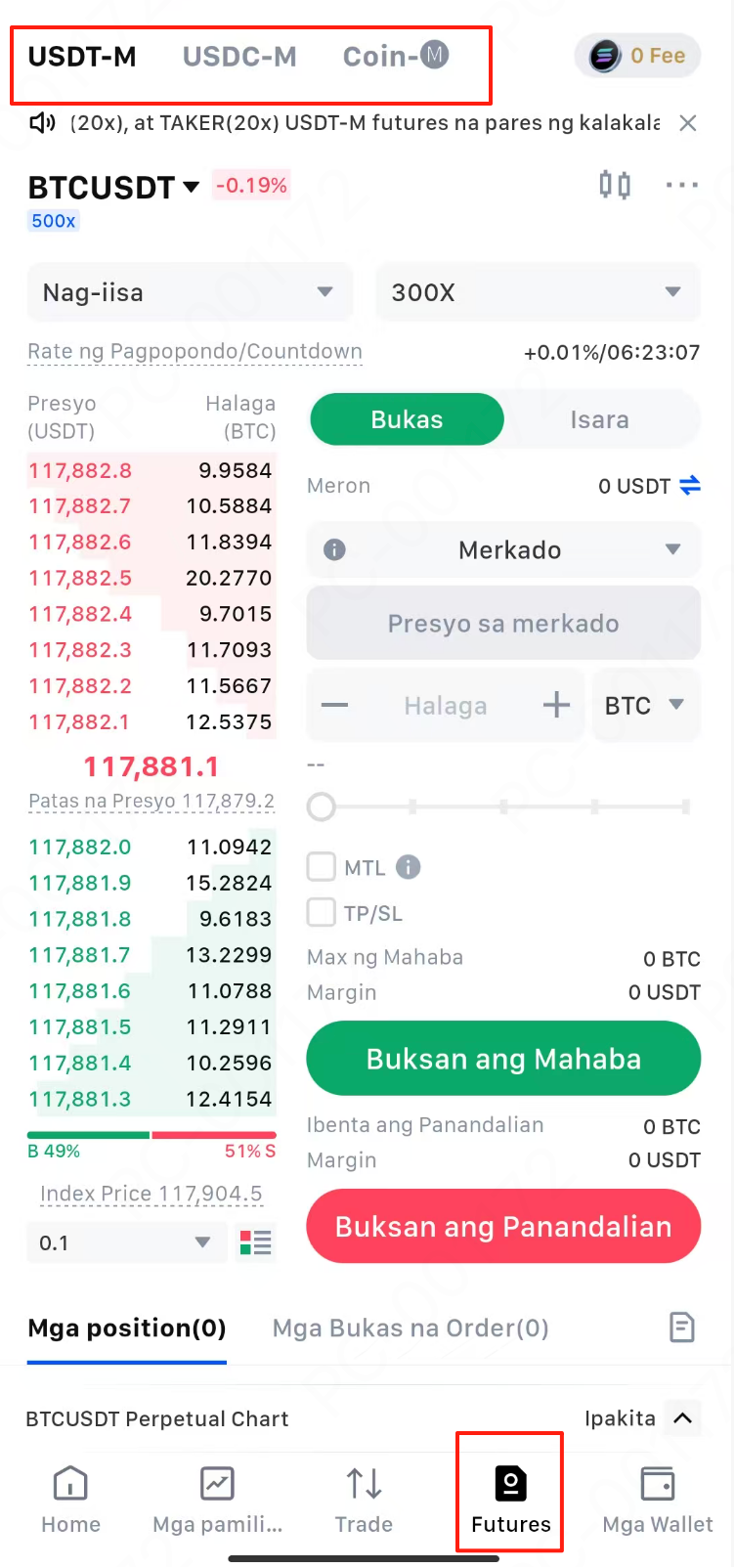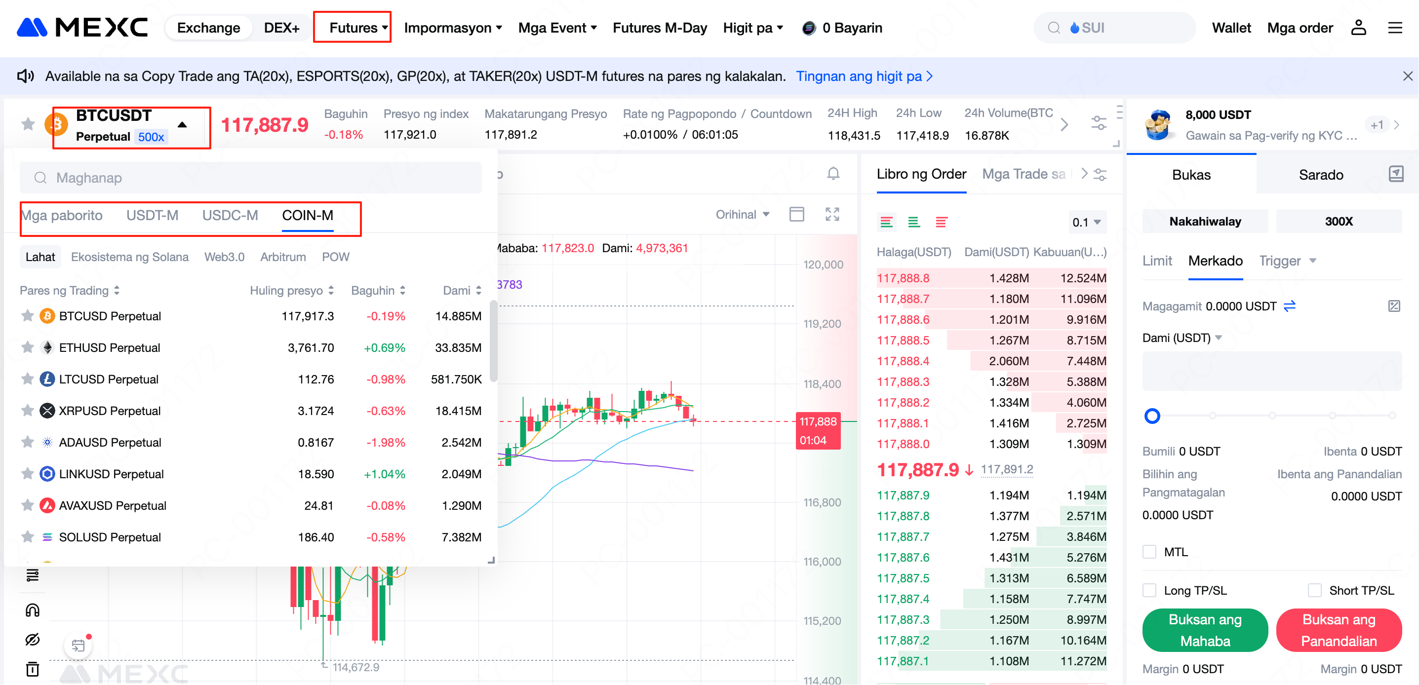 1) Piliin ang Futures sa tuktok na navigation bar at piliin ang USDT-M o Coin-M para ma-access ang trading page.