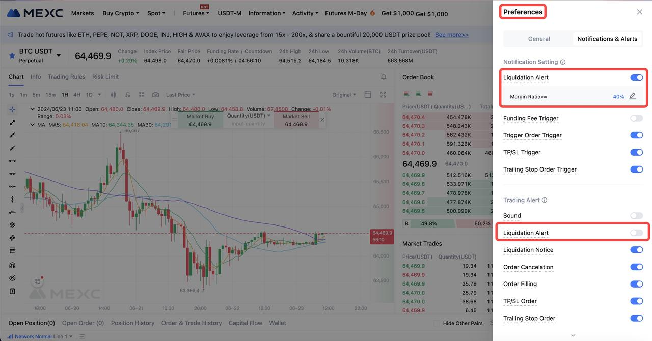 4.2 Itakda ang mga Alerto at Notification: Paganahin ang mga tampok ng alerto at notification sa platform ng kalakalan upang makatanggap ng mga napapanahong paalala kapag lumalapit o bumaba ang balanse ng iyong account sa antas ng maintenance margin. Sa MEXC, maaari mong i-configure ang mga alerto na ito sa seksyong Mga Kagustuhan. Kapag pinagana, ang mga notification ay ipapadala sa pamamagitan ng email, SMS, in-app messages, o push notifications.