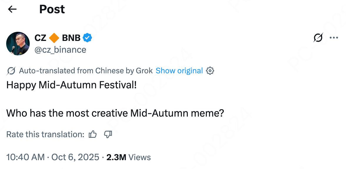 Naging viral ang malikhaing konseptong ito matapos mag-post si Changpeng Zhao (CZ) ng pagbati sa Mid-Autumn Festival noong Oktubre 6, 2025, na nagtatanong, "Sino ang may pinaka-creative na Mid-Autumn meme?" Ang network ng BSC ay binaha ng mga nagte-trend na memecoin, at ang BIANRENSHENG ay namumukod-tangi sa kanyang cultural resonance at makawiwili sa komunidad.