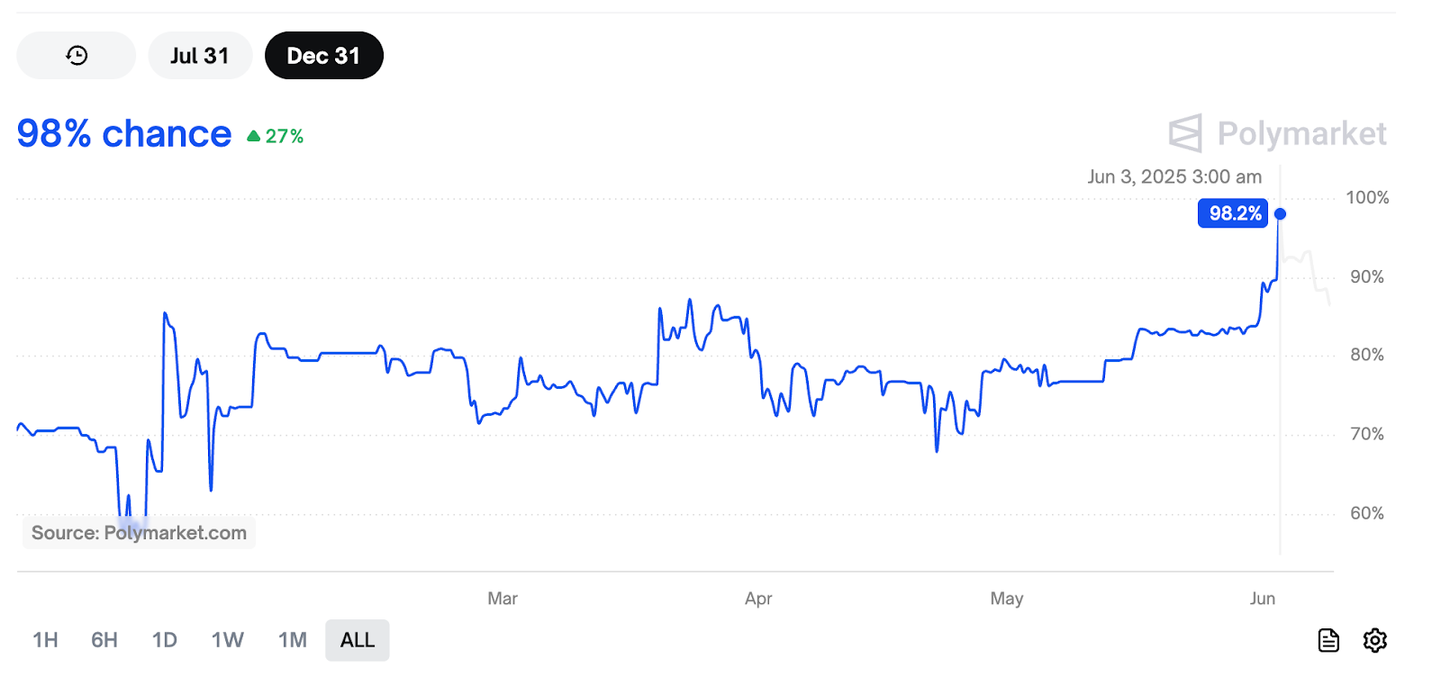 Matagal nang isa sa mga pangunahing inaabangan ng mga mamumuhunan sa merkado ng cryptocurrency ang pag-apruba ng ETF. Ayon sa datos mula sa Polymarket, ang posibilidad na maaprubahan ng U.S. Securities and Exchange Commission (SEC) ang XRP spot ETF ngayong 2025 ay umakyat na sa 98%. Ang balitang ito ay nagdulot ng malawakang atensyon at talakayan sa merkado, habang sabik na inaabangan ng mga mamumuhunan ang pormal na pag-apruba ng XRP spot ETF.