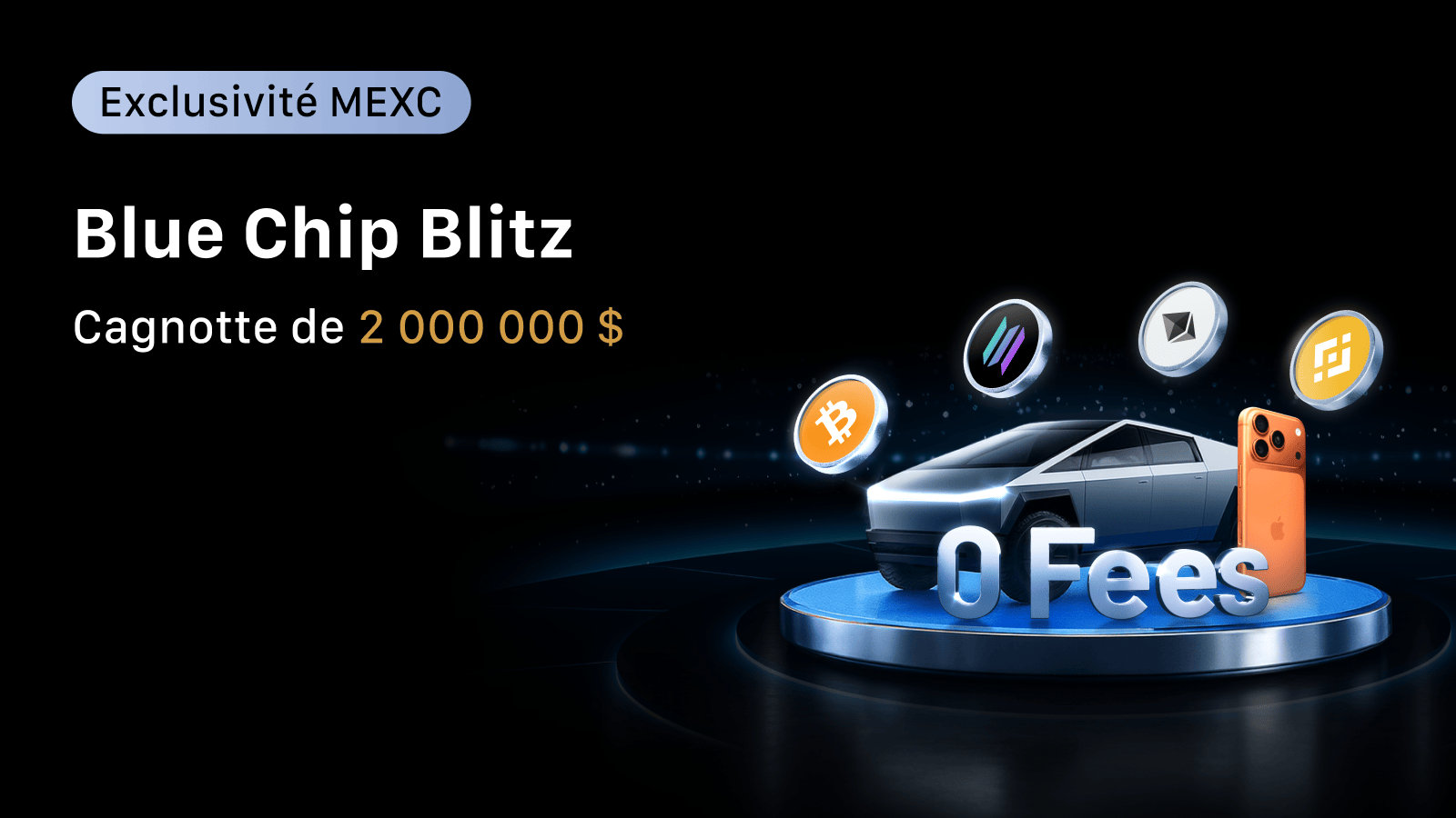Le marché a été difficile, mais les fondations restent solides. Nous lançons Blue Chip Blitz pour remettre les projecteurs là où ils doivent être — sur les piliers des cryptomonnaies : BTC, ETH, BNB et SOL. Tradez sans frais, gagnez jusqu'à 600 % de TAEG et partagez 2 M $ de récompenses, dont une Tesla Cybertruck !