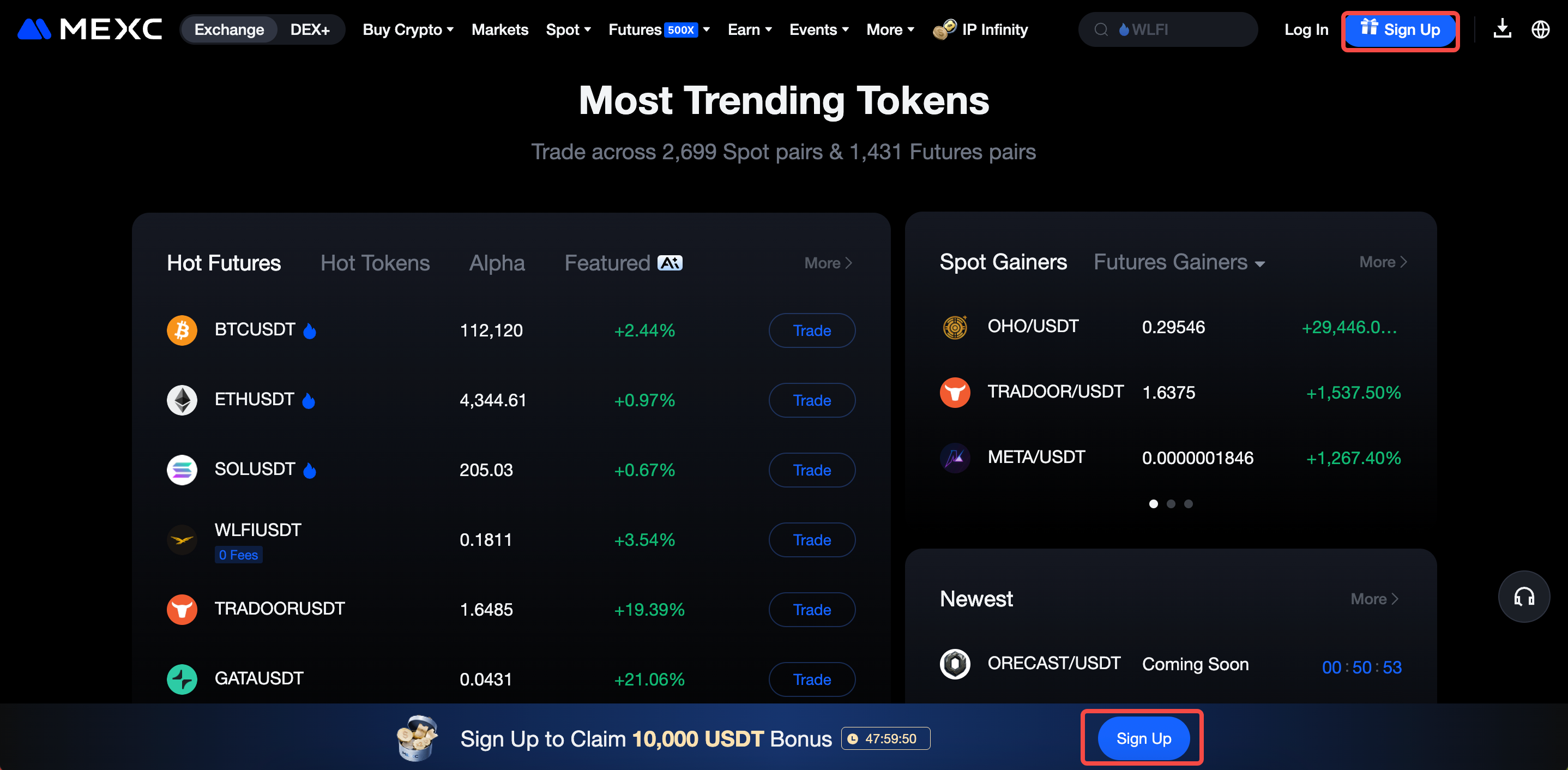 Ensuite, cliquez sur S'inscrire pour un nouveau compte MEXC.