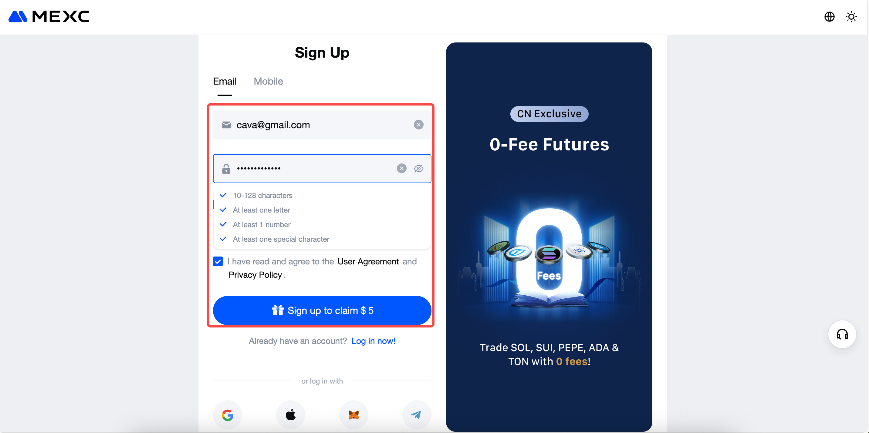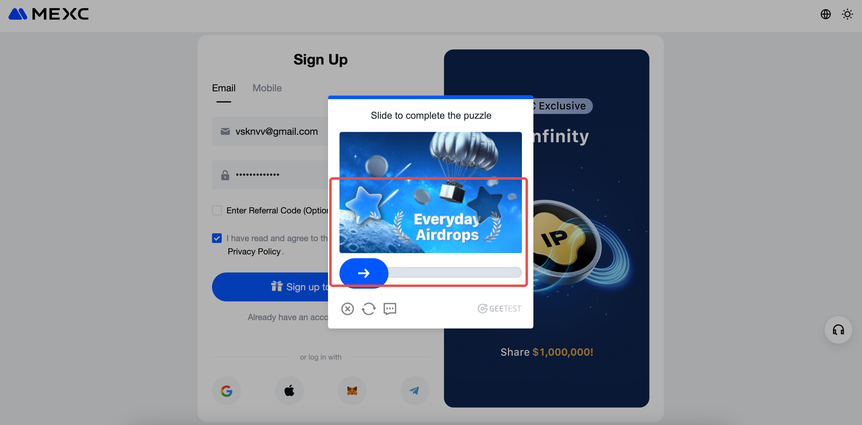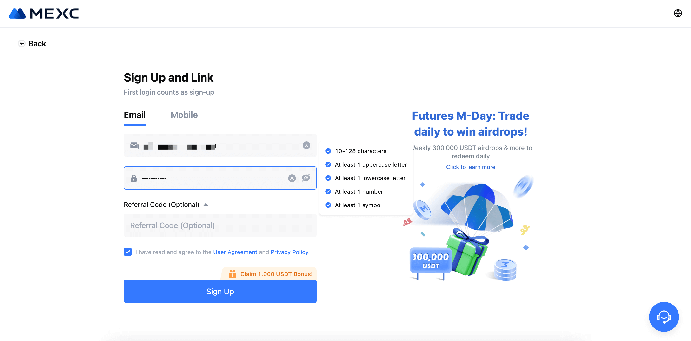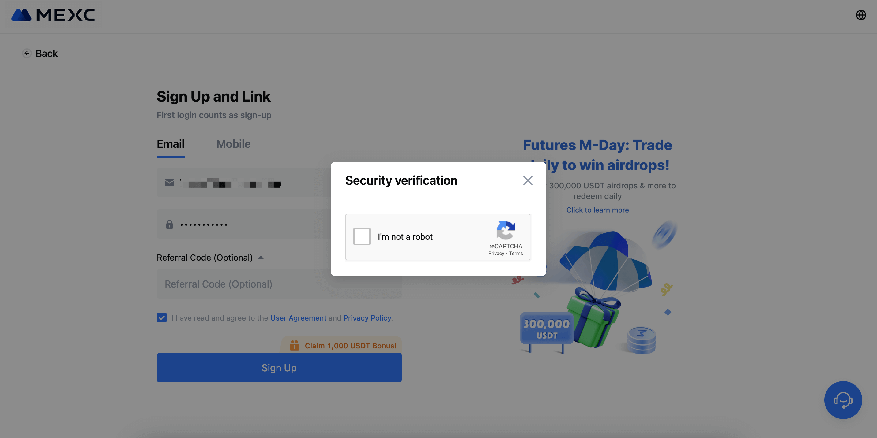 Catatan: Jika Anda memiliki kode referral, centang bidang input "Masukkan Kode Referral". Untuk mempelajari selengkapnya tentang program referral, silakan lihat panduan Mengundang Teman untuk Mendaftar di MEXC.