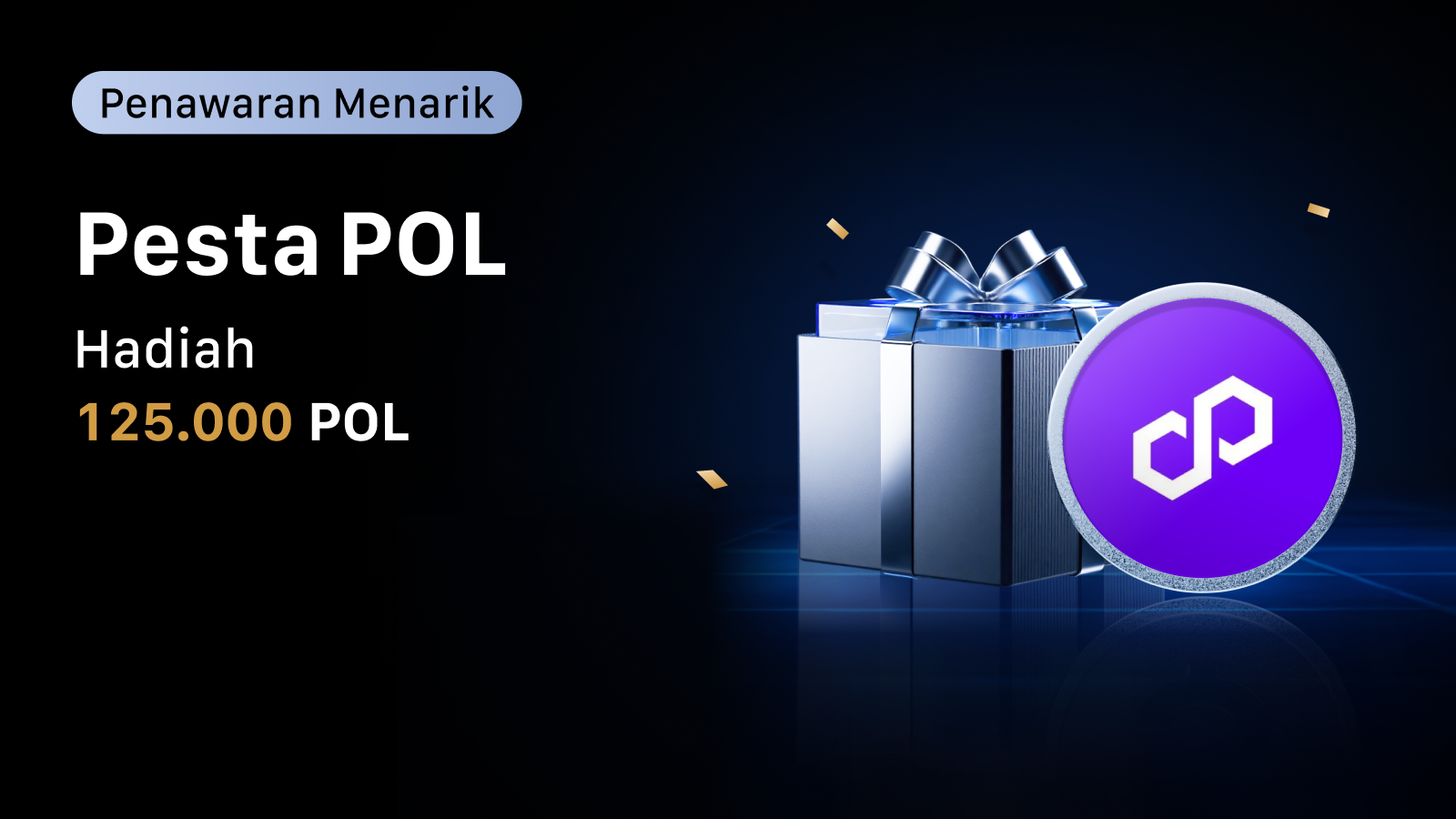 Selama acara berlangsung, lakukan deposit bersih minimal 400 POL atau 100 USDT atau 100 USDC untuk menerima 40 POL. Hadiah dibatasi hingga 625 pengguna yang memenuhi syarat berdasarkan siapa yang tercepat.