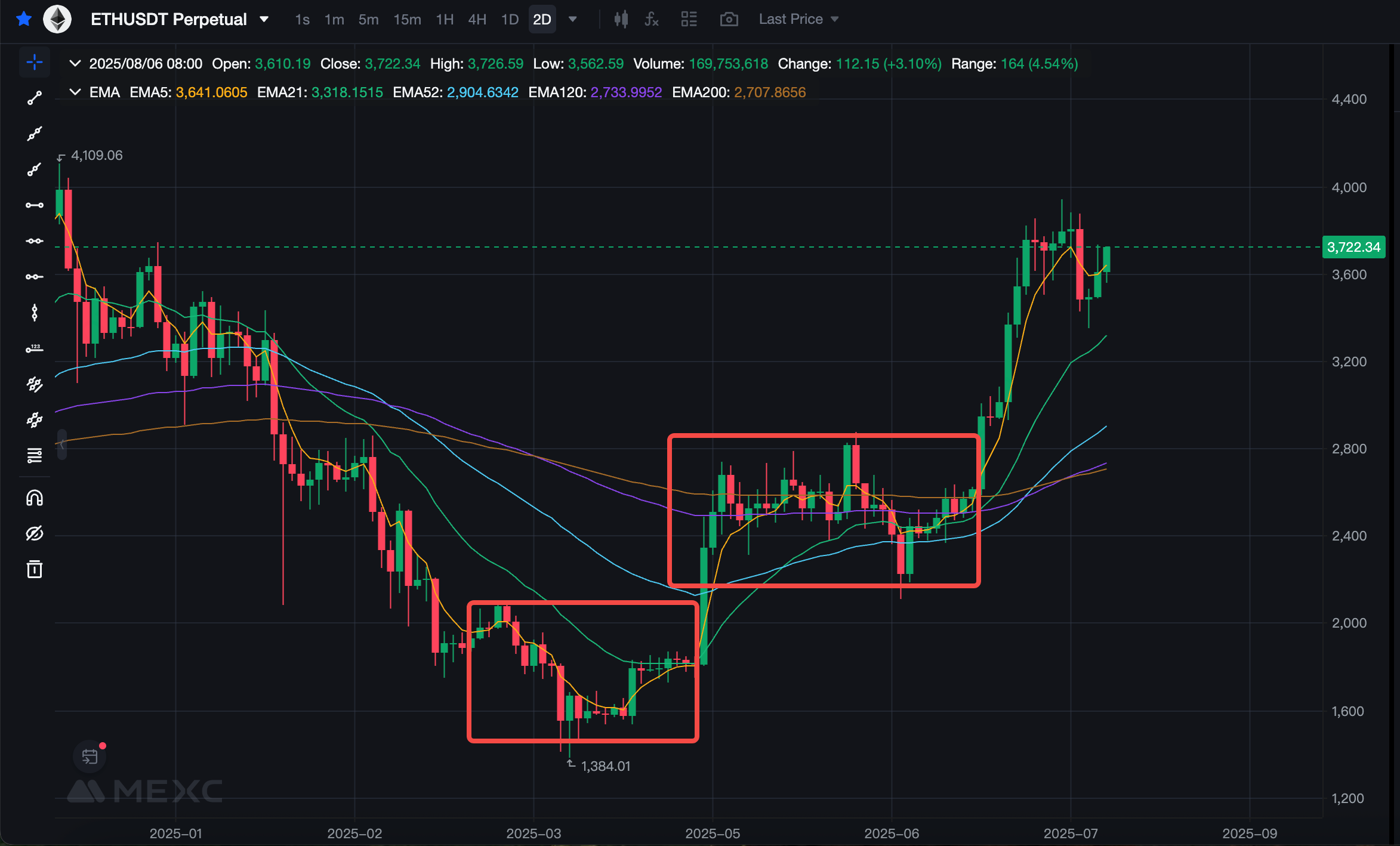 Sementara volatilitas tinggi pasar futures mata uang kripto menciptakan banyak peluang perdagangan, dapat diamati bahwa dalam jangka waktu yang lebih panjang, sebagian besar mata uang kripto sebenarnya bergerak dalam rentang harga yang ditentukan sekitar 80% dari waktu. Misalnya, grafik di bawah menunjukkan fluktuasi harga Futures Perpetual ETHUSDT dalam rentang tersebut.
