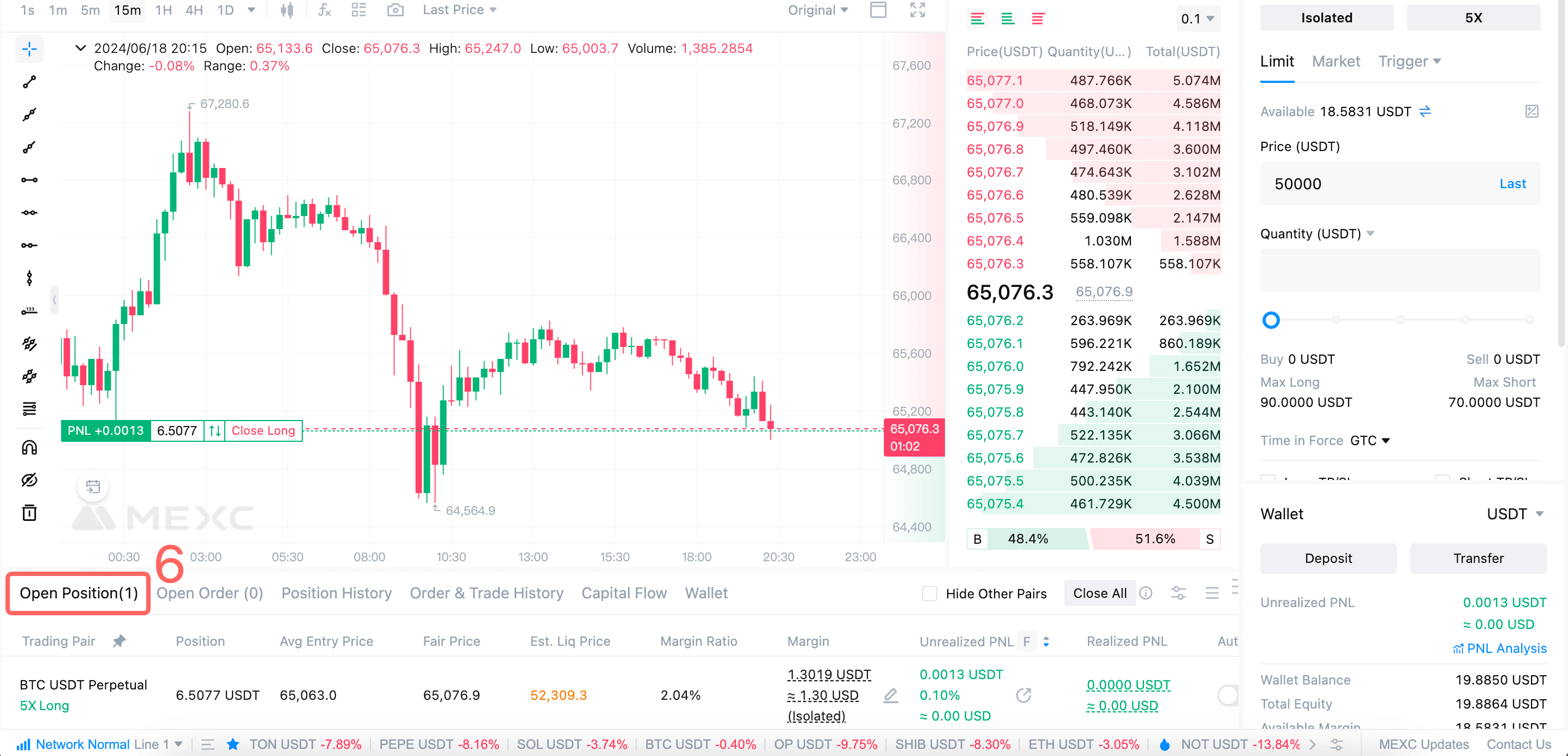 Buka situs web resmi MEXC, lalu masuk ke akun Anda. Dalam Futures, pilih Futures Perpetual USDT-M untuk masuk ke halaman perdagangan. Pada panel pemasangan order di sisi kanan, buat limit order.