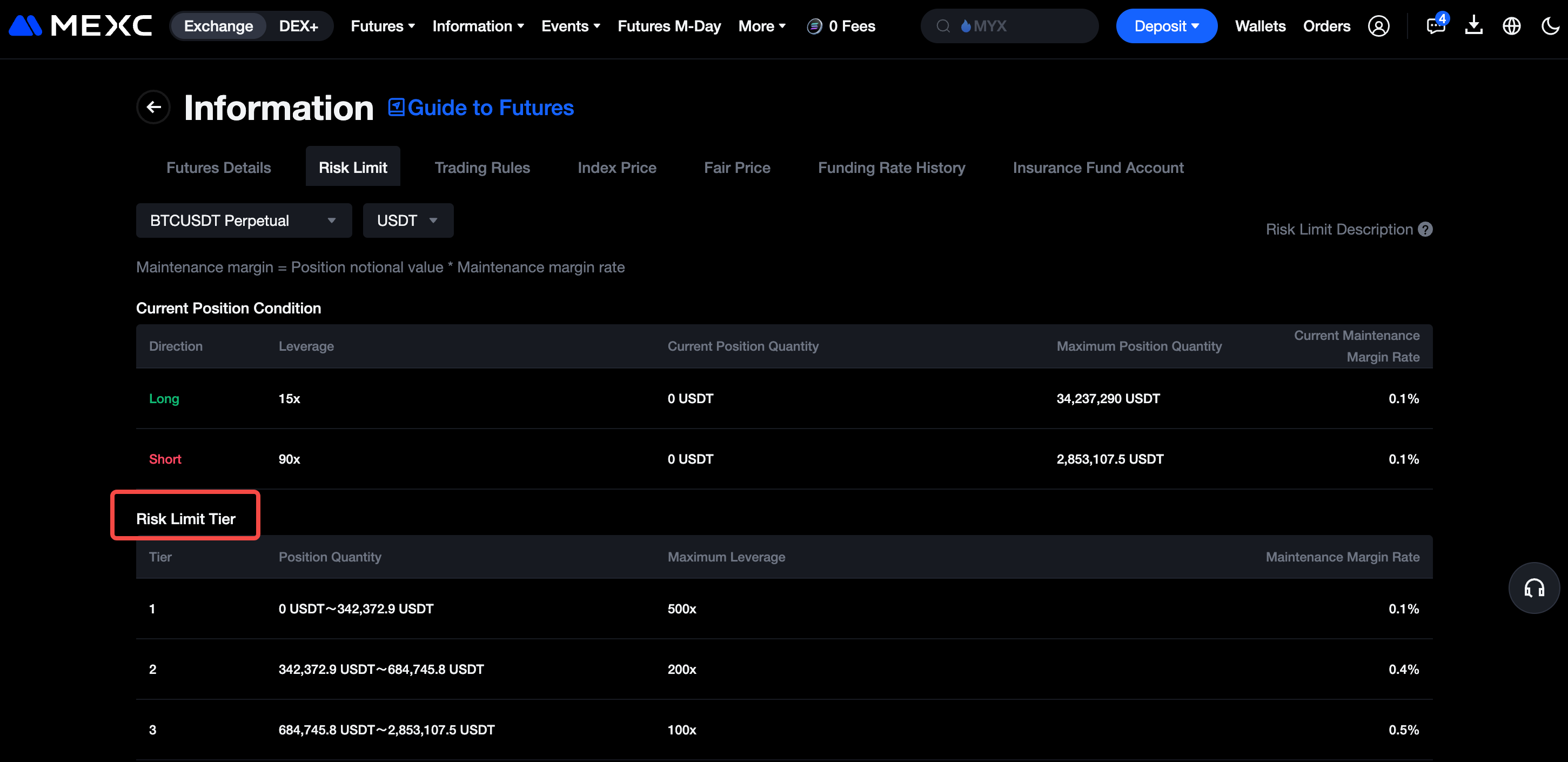 Untuk mengurangi hal ini, MEXC menerapkan mekanisme limit risiko pada semua akun perdagangan. Sistem ini menggunakan model margin bertingkat untuk pengendalian risiko: makin besar kuantitas posisi, makin rendah leverage maksimum yang diizinkan. Pedagang dapat menyesuaikan leverage secara manual, tetapi persyaratan margin awal ditentukan oleh leverage yang dipilih.
