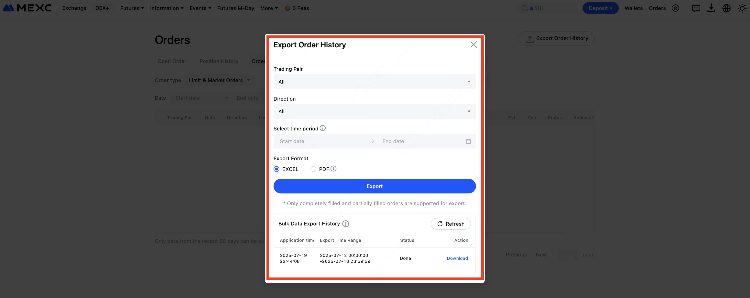 Pada halaman Order Futures, buka Riwayat Order & Perdagangan, lalu klik Ekspor Riwayat Order untuk membuka jendela ekspor.