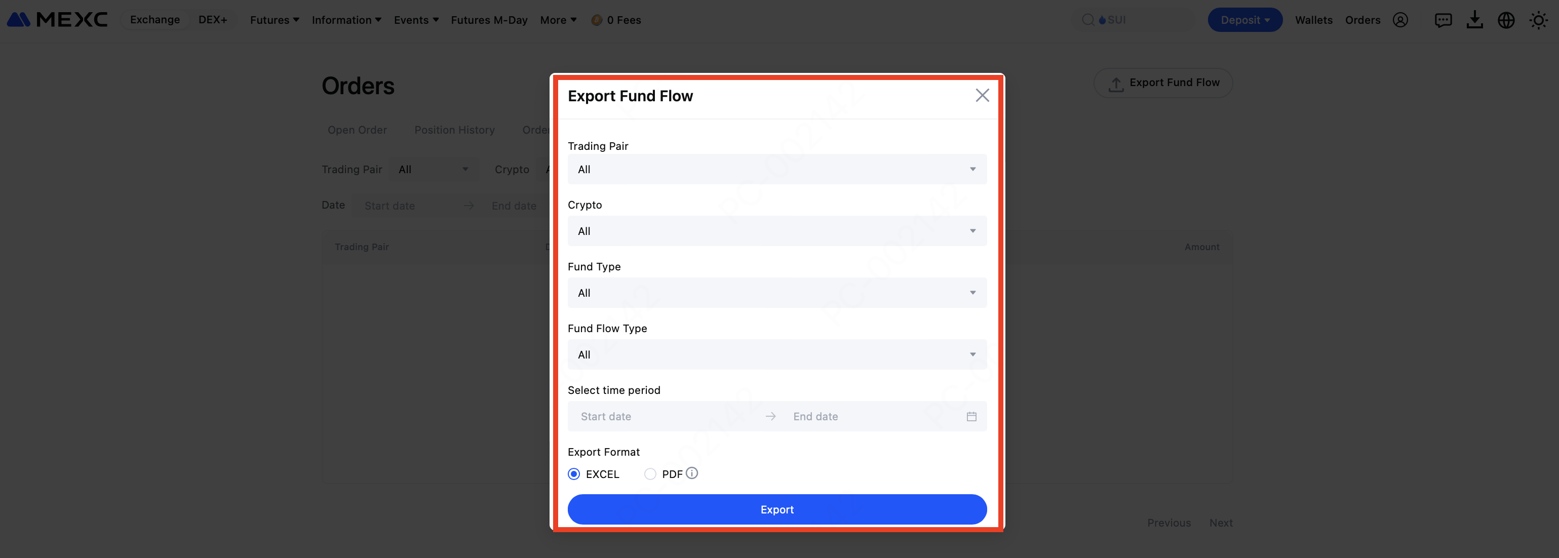 Setelah memilih pasangan perdagangan, kripto, jenis dana, jenis aliran dana (aliran masuk atau aliran keluar), dan periode waktu, pilih PDF sebagai format ekspor. Klik Ekspor untuk mulai mengunduh data aliran dana Anda dalam format PDF. Harap diperhatikan: Mungkin diperlukan waktu untuk membuat PDF. Jika ekspor berisi lebih dari 10.000 catatan, sistem akan beralih ke mode ekspor data massal.