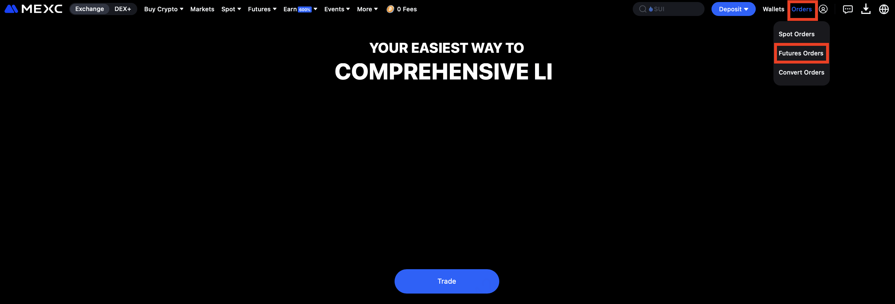 Kunjungi situs web resmi MEXC, lalu masuk ke akun Anda. Dari bilah navigasi atas di beranda, arahkan kursor ke Order, lalu pilih Order Futures untuk masuk ke halaman terkait.