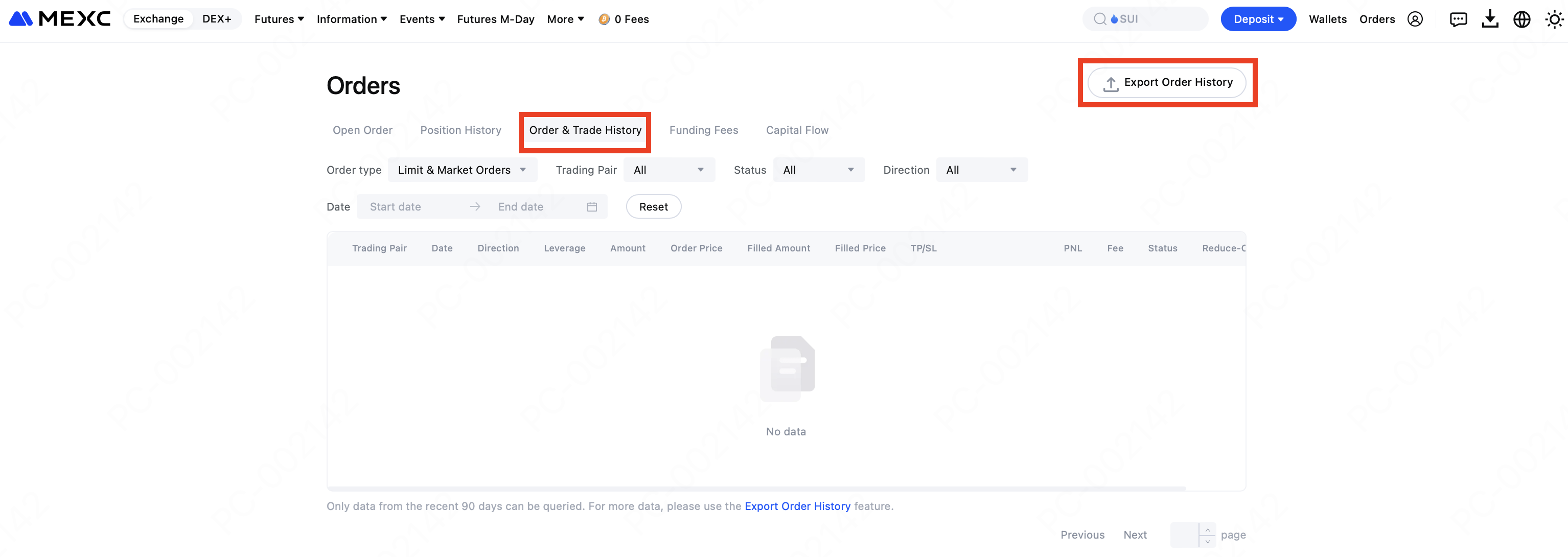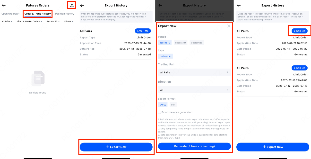 MEXC mendukung ekspor versi PDF catatan order Futures lampau dan aliran dana pada platform Web dan Aplikasi. Setiap pengguna berhak melakukan 10 kali percobaan ekspor per bulan untuk laporan akun futures. Setiap laporan yang dihasilkan dapat mencakup data hingga 180 hari terakhir, sehingga pengguna dapat mengambil informasi perdagangan yang dibutuhkan secara fleksibel.