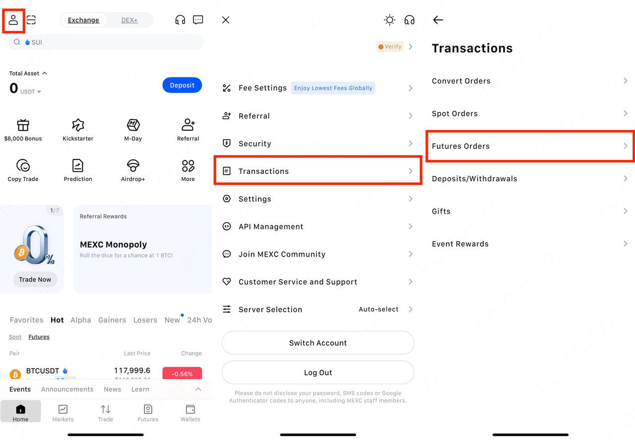 Buka Aplikasi MEXC, lalu masuk ke akun Anda. Ketuk ikon profil di sudut kiri atas, pilih Transaksi, lalu pilih Order Futures.