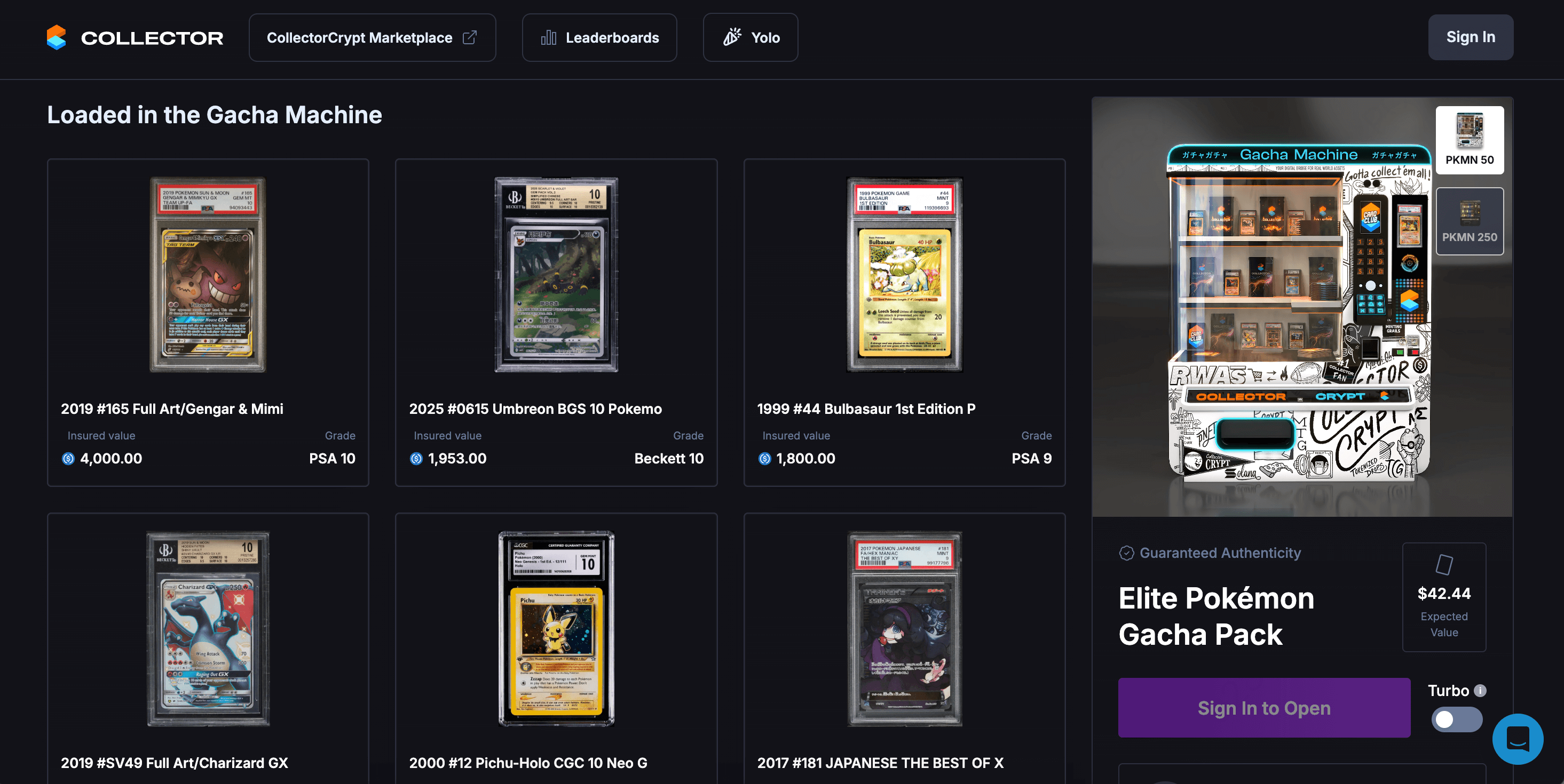 Gacha RWA dari Collector Crypt adalah produknya yang paling populer dan merupakan produk paket penguat digital dengan ekspektasi nilai (EV) tertinggi di pasaran. Rata-rata, pengguna menikmati ekspektasi nilai positif sebesar +5% hingga +10%, sehingga menjadikannya pengalaman berbelanja yang lebih menyerupai game daripada mesin judi yang menguntungkan bandar. Laba sepenuhnya dihasilkan melalui buyback, sehingga memungkinkan kolektor untuk: