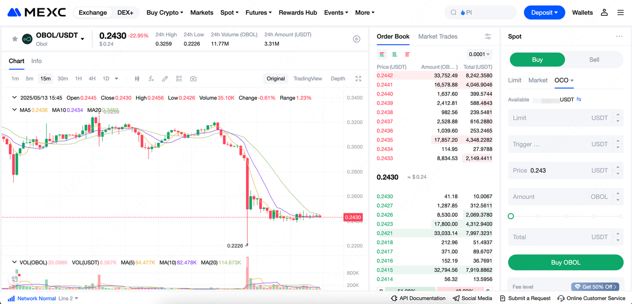 2) Cari “OBOL” di bilah pencarian, lalu pilih trading Spot atau Futures OBOL 3) Pilih jenis order, masukkan kuantitas dan harga, lalu selesaikan transaksi
