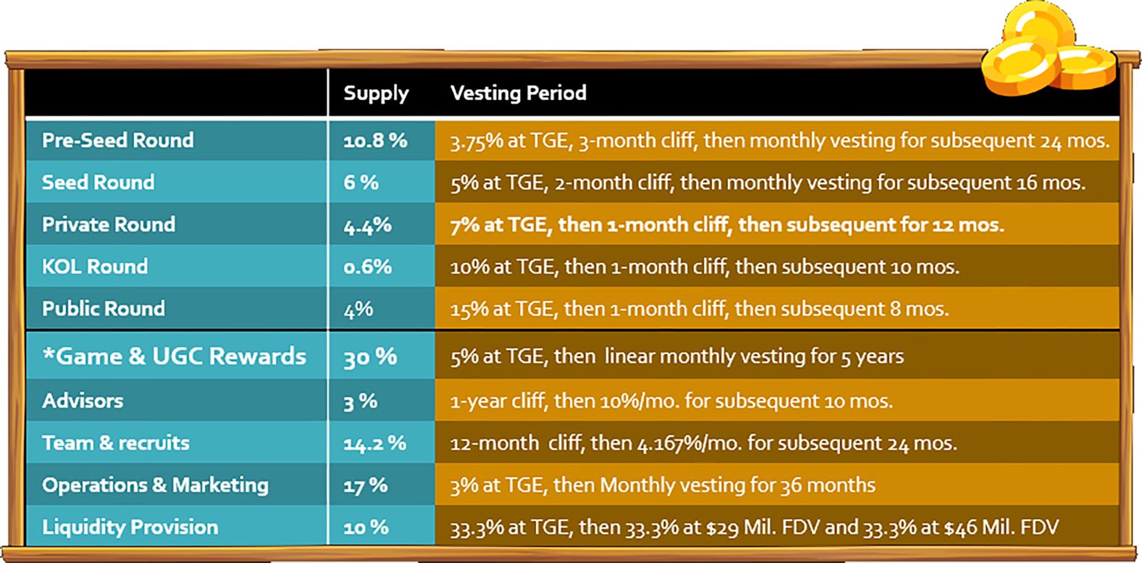 *Reward Game & UGC | 30% | 5% saat TGE, lalu vesting linear bulanan selama 5 tahun |