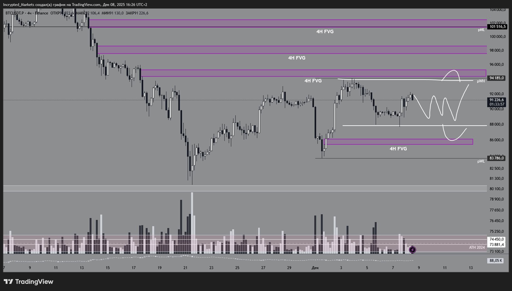 Minggu lalu, pasar menunjukkan tanda-tanda pemulihan, dengan bitcoin mencoba untuk mendapatkan pijakan di atas $90.000. Harga mulai naik, tetapi pada 4 Desember 2025, dengan latar belakang data makro, pasar melemah: zona gap (FVG) pada grafik empat jam selesai, beberapa posisi long tersingkir oleh stop, dan minggu ditutup lebih dalam mode "istirahat" daripada kelanjutan reli.