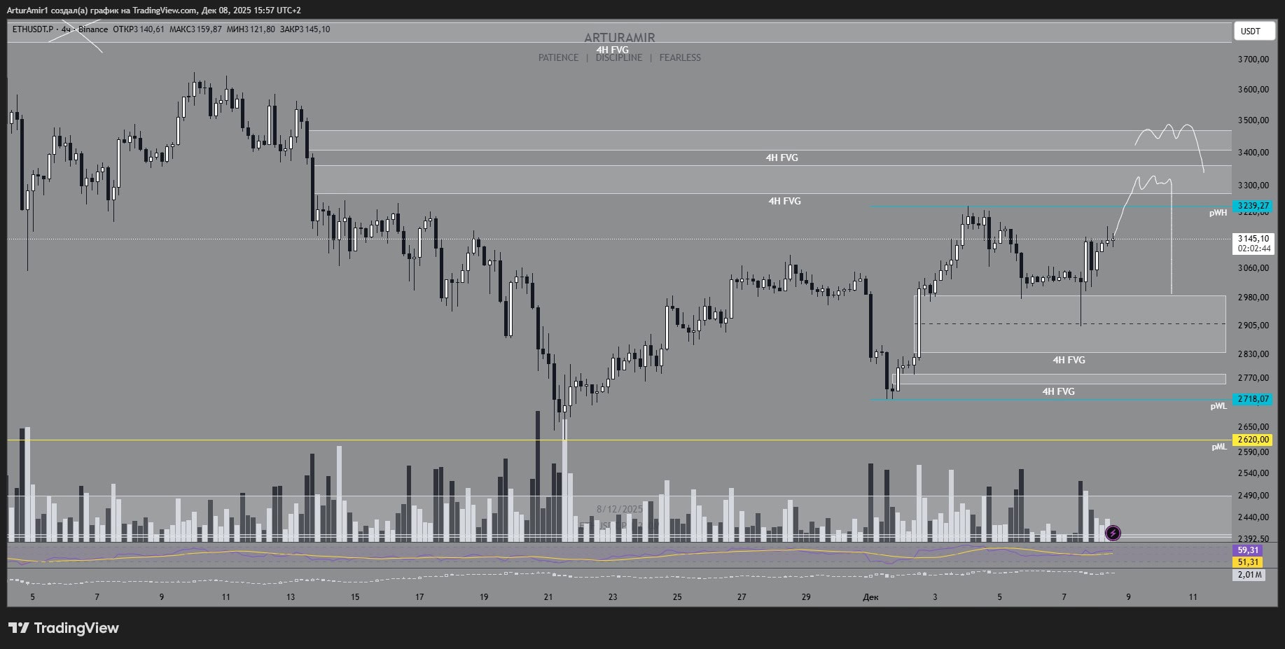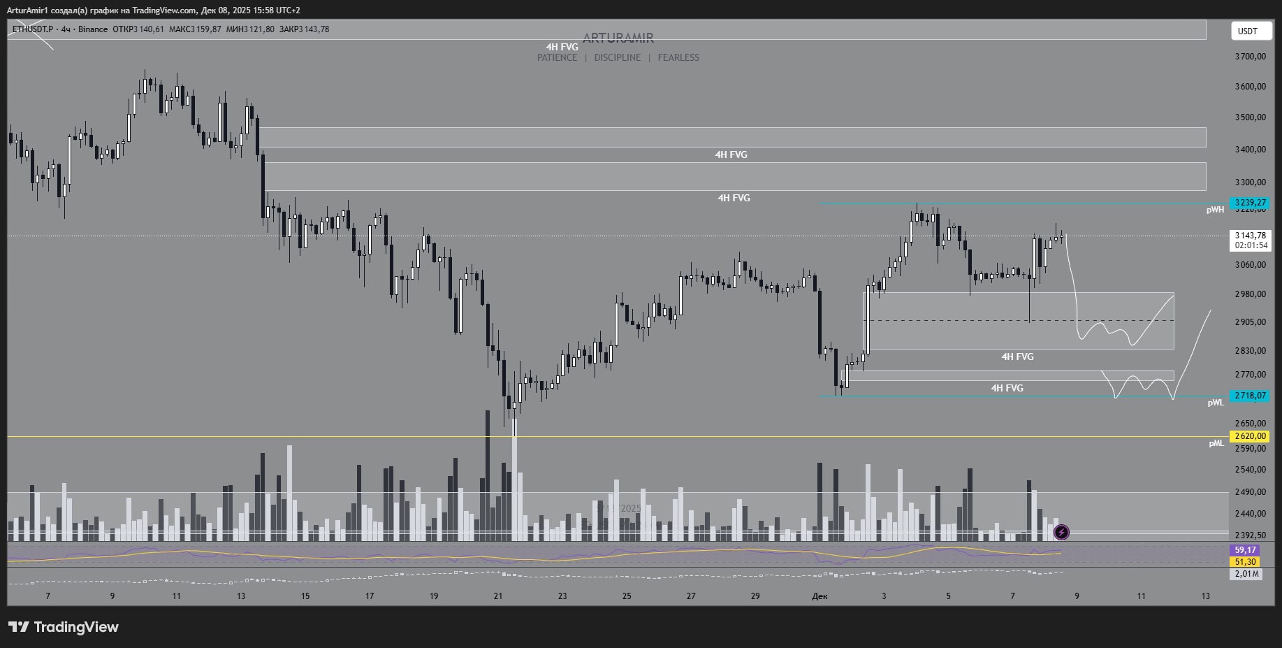 Idenya di sini adalah sebagai berikut — pertumbuhan saat ini habis, Ethereum dibawa ke salah satu FVG di bawah, basis terbentuk di sana, dan mereka mencoba membawa harga kembali ke pWH dan lebih tinggi.