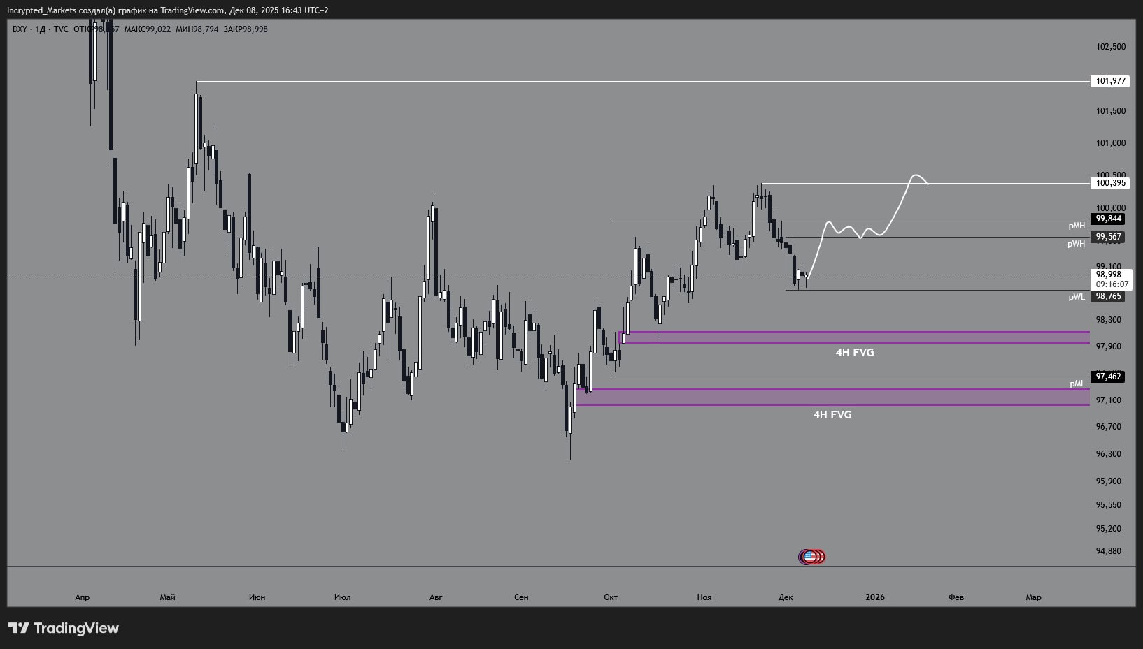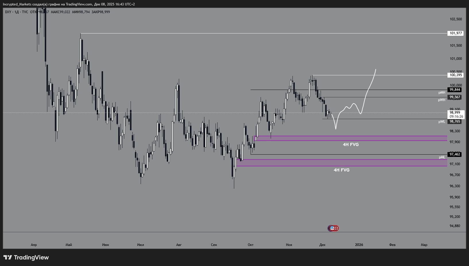 Kemudian indeks mungkin masuk ke koreksi ke atas — dengan tujuan menguji batas atas rentang minggu-minggu terakhir dan sebagian "memeras" short berlebihan dalam dolar keluar dari pasar. Untuk pasar kripto, ini adalah skenario headwind moderat: keruntuhan tajam tidak diperlukan, tetapi reli akan sulit dilanjutkan dengan latar belakang penguatan DXY.