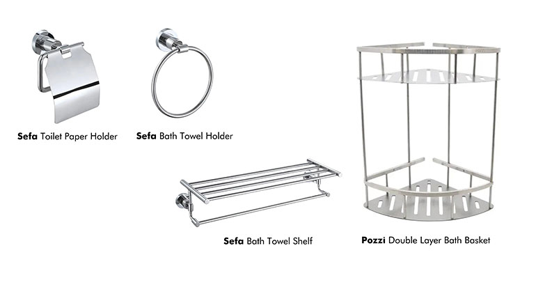 Ruang dilengkapi melalui detail yang halus namun disengaja. Aksesori seperti Sefa Toilet Paper Holder, Sefa Bath Towel Holder, dan Sefa Bath Towel Shelf berkontribusi pada fungsionalitas sambil mempertahankan harmoni visual. Pozzi Double Layer Bath Basket menawarkan penyimpanan praktis, memastikan barang-barang sehari-hari tetap dapat diakses tanpa mengganggu garis bersih ruangan. Potongan-potongan pelengkap ini bekerja bersama dengan tenang, memperkuat rasa keseimbangan dan kemudahan dalam ruang.