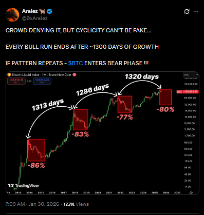 Menurut perkiraannya, potensi penurunan 39% tersebut masih dalam batas normal siklus kenaikan Bitcoin, yang sering kali diwarnai oleh koreksi sebesar 30 hingga 80%.