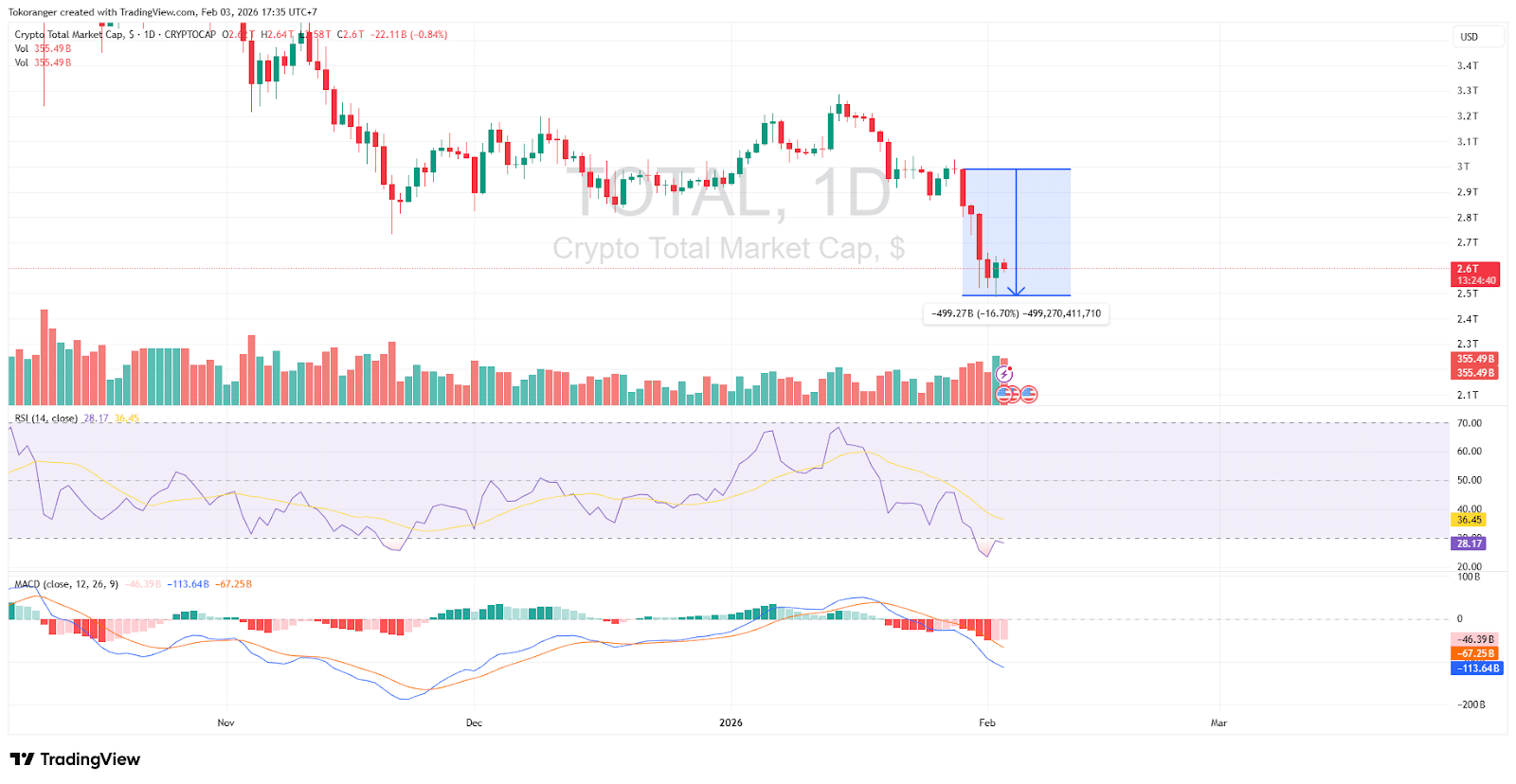 Jika kita menambahkan faktor pertama, yaitu volatilitas pasar, risk-off sentiment, dan likuidasi besar, maka penurunan Bitcoin di Januari menjadi lebih kontekstual. Dalam waktu kurang dari satu minggu, Bitcoin turun lebih dari 16,7%, dan penurunan ini terjadi secara menyeluruh di pasar kripto. Total kapitalisasi pasar kripto terkoreksi sekitar USD 500 miliar, dari kisaran USD 3 triliun turun hingga mendekati USD 2,5 triliun. Dengan skala market cap sebesar ini, proses pemulihan tentu membutuhkan waktu dan aliran dana yang tidak kecil. Artinya, dampak dari likuidasi massal dan keluarnya likuiditas akibat risk-off sentiment berpotensi masih akan terasa dalam jangka pendek hingga menengah ke depan.