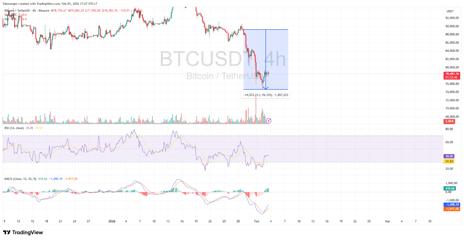 Sebelumnya, tim research Tokocrypto menyebutkan bahwa Bitcoin sedang dalam fase “lampu kuning” ketika berada di level harga $88.000 sementara arus uang global mulai beralih ke aset komoditas seperti emas. Analisis memproyeksikan jika level ini jebol, pasar berisiko mengalami koreksi tajam menuju $74.000 dan per 2 Februari 2026, Bitcoin telah menyentuh level yang sebelumnya di antisipasi.