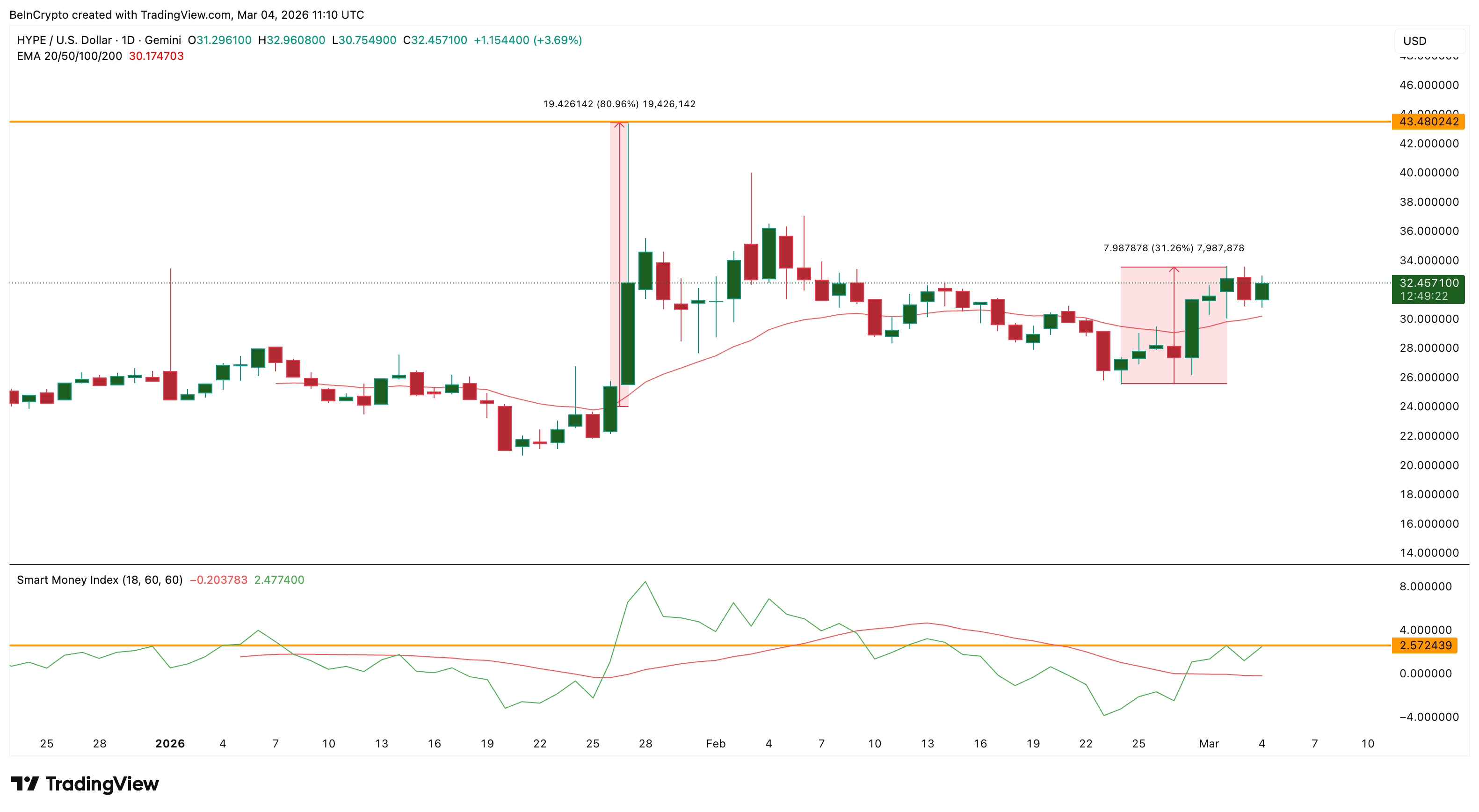 Dari sisi teknikal, harga HYPE baru saja kembali menembus indikator 20-day exponential moving average (EMA), yang sebelumnya juga menjadi titik awal reli besar pada Januari.