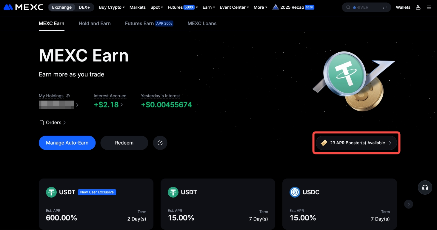 Buka halamanFutures Earn di MEXC. Di beranda, Anda dapat melihat jumlah APR Booster yang saat ini dapat digunakan.