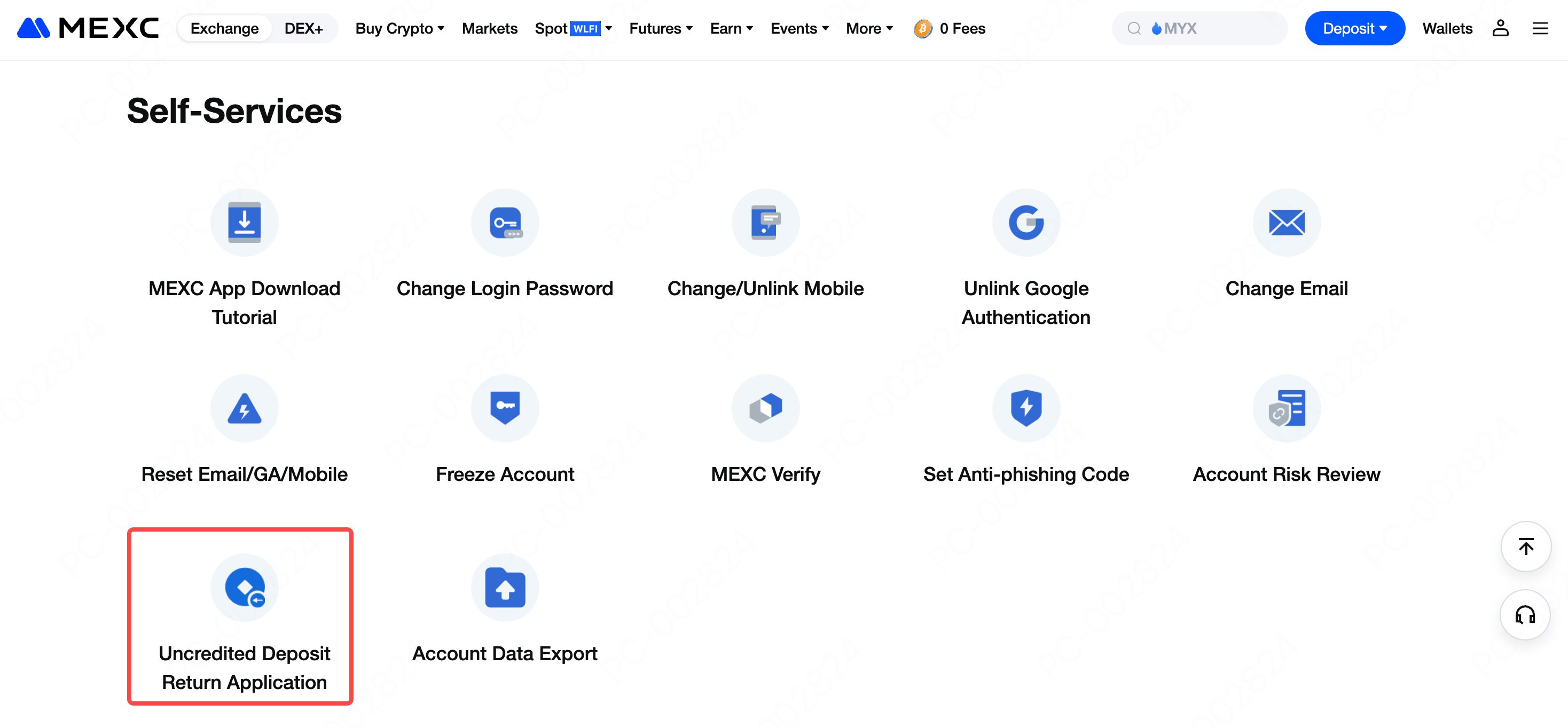 Pada halaman Pusat Bantuan MEXC, klik tombol Permohonan Pengembalian Deposit yang Tidak Dikreditkan.